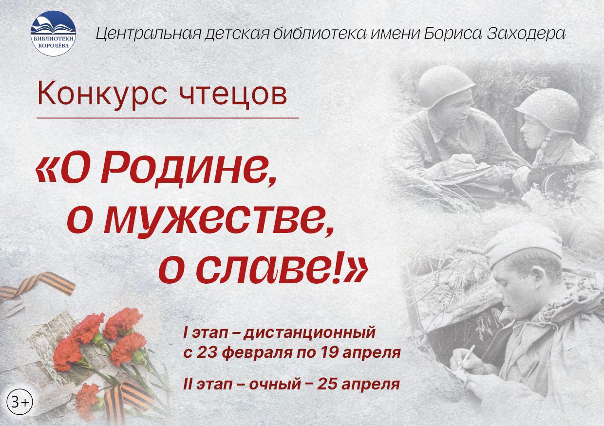 Несомненно, поэтическое слово обладает значительной силой, способной вдохновить на великие свершения, сформировать уважительное отношение к историческому наследию, укрепить связь поколений и бережно сохранить память обо всех ратных событиях отечественной истории. Дорогие друзья, Центральная детская библиотека имени Бориса Заходера приглашает вас принять участие в конкурсе чтецов "О Родине, о мужестве, о славе!". Что для этого нужно? Записать видеоролик прочтения стихотворения патриотической тематики и прислать его нам на электронную почту cdb-korolev@yandex.ru в период с 23 февраля по 19 апреля 2026 года включительно. Важно! Вместе с видеороликом обязательно приложить согласие на обработку персональных данных (Положение о конкурсе, Приложение № 1). Дождитесь нашего звонка или письма по электронной почте с приглашением на второй этап конкурса – подведение итогов, которое состоится 25 апреля в 12 часов по адресу: Московская область, город Королёв, улица 50-летия ВЛКСМ, дом 5/16. При возникновении вопросов звоните по номеру телефона +7(495) 511-69-96 с 11:00 до 19:00 ежедневно, кроме пятницы. Более полную информацию о конкурсе вы можете найти в положении о конкурсе.