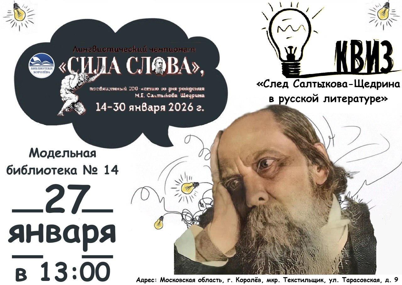 В 2026 году исполняется 200-лет со дня рождения великого русского писателя, журналиста, редактора журнала «Отечественные записки» Михаила Евграфовича Салтыкова-Щедрина. На встрече ведущая расскажет присутствующим о том, что его сказки, очерки, пьесы, повести и рассказы знакомы практически каждому со школьной скамьи. Писатель имел прекрасное и очень тонкое чувство юмора, острый ум и потрясающий интеллект.