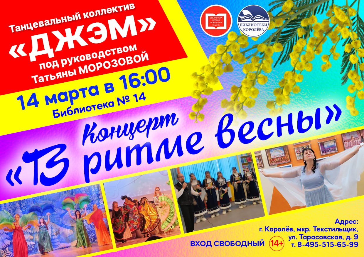 Приглашаем вас на незабываемый концерт "В ритме весны" танцевального коллектива "ДЖЭМ" под руководством Татьяны Морозовой, где песни и танцы наполнят сердце теплом и радостью!