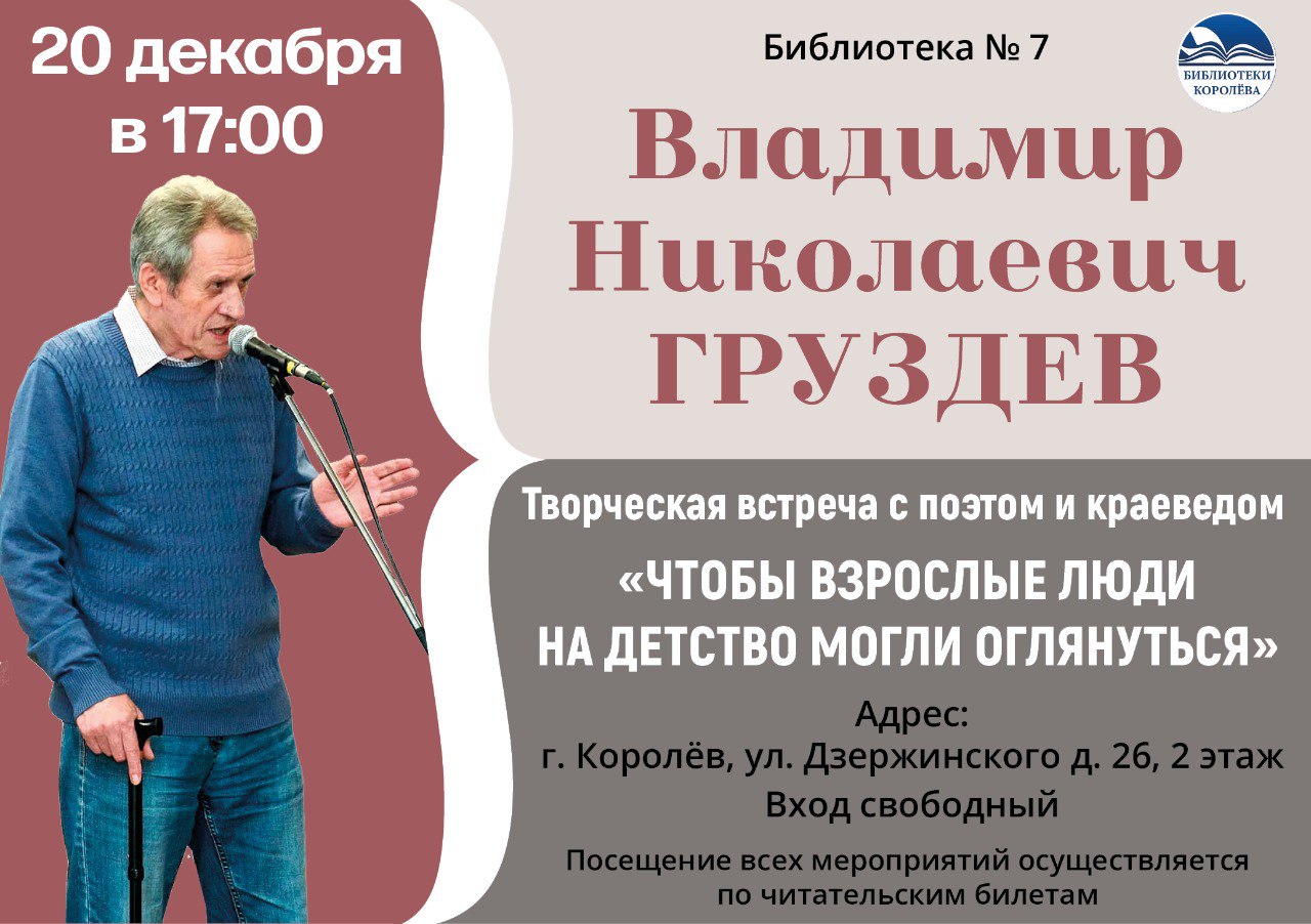20 декабря приглашаем на творческую встречу "Чтобы взрослые люди на детство могли оглянуться" с поэтом и краеведом В. Н. Груздевым, лауреатом литературного конкурса им. С. Н. Дурылина, лауреатом и дипломантом Всероссийского конкурса "Гринландия" и дипломантом конкурса им. Роберта Рождественского, членом жюри многочисленных литературных конкурсов.