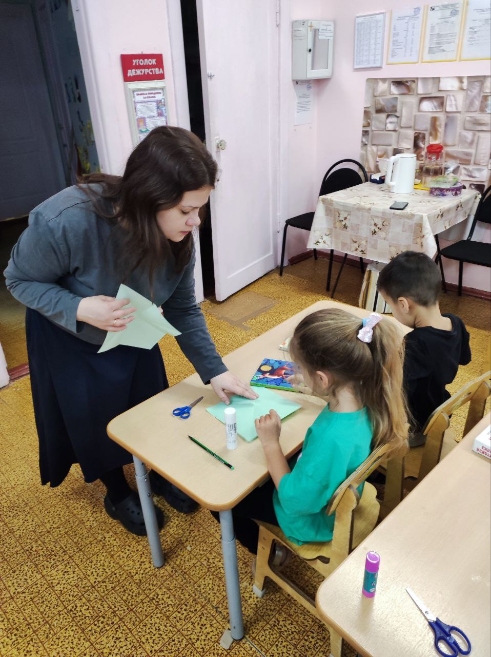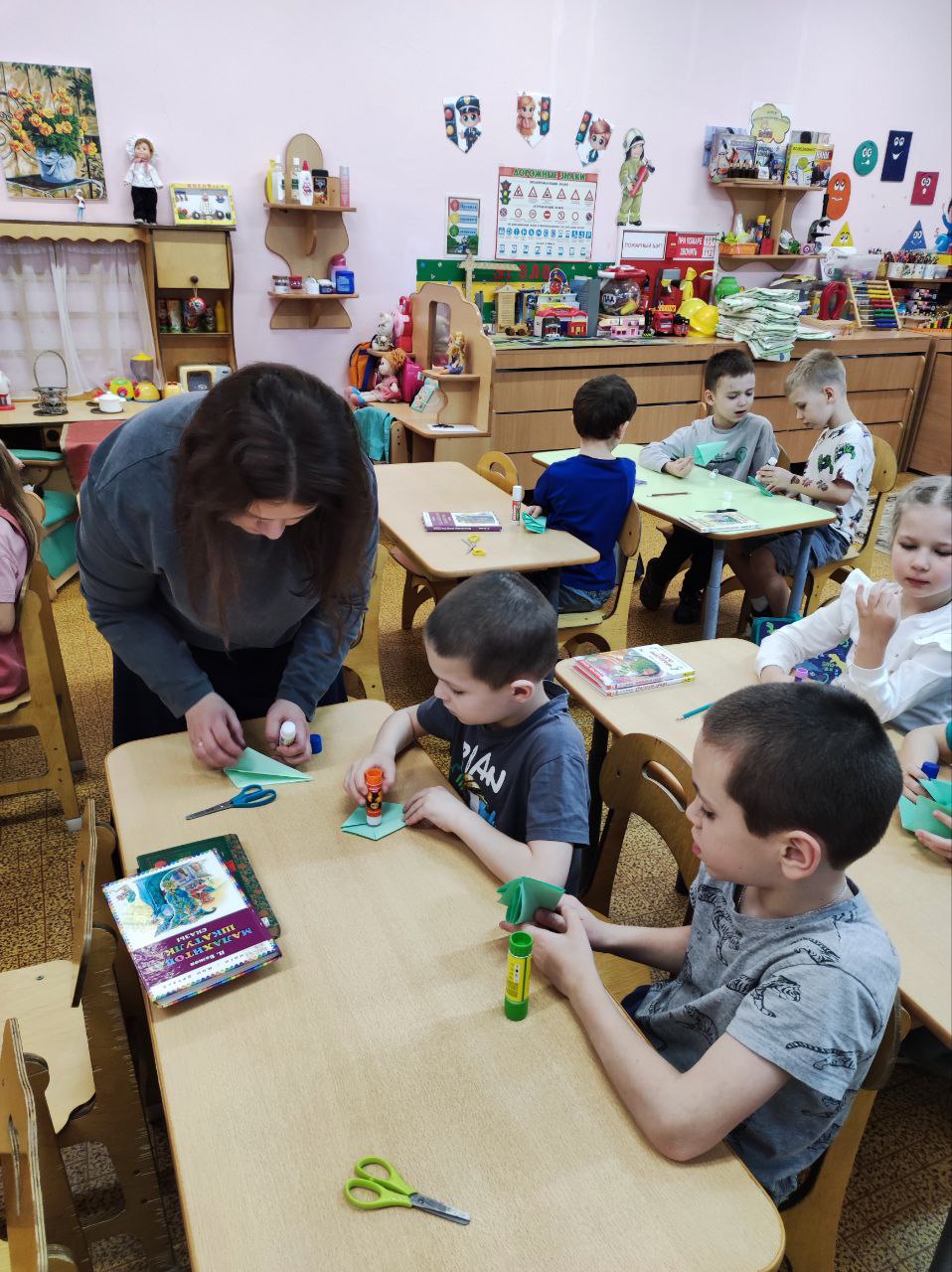 Затем, вдохновившись сюжетом, юные слушатели принялись мастерить зелёный цветок в технике оригами. Работа была сложной, но куст из малахитовых цветов был собран. Все участники мастер-класса остались довольны своими изделиями.
