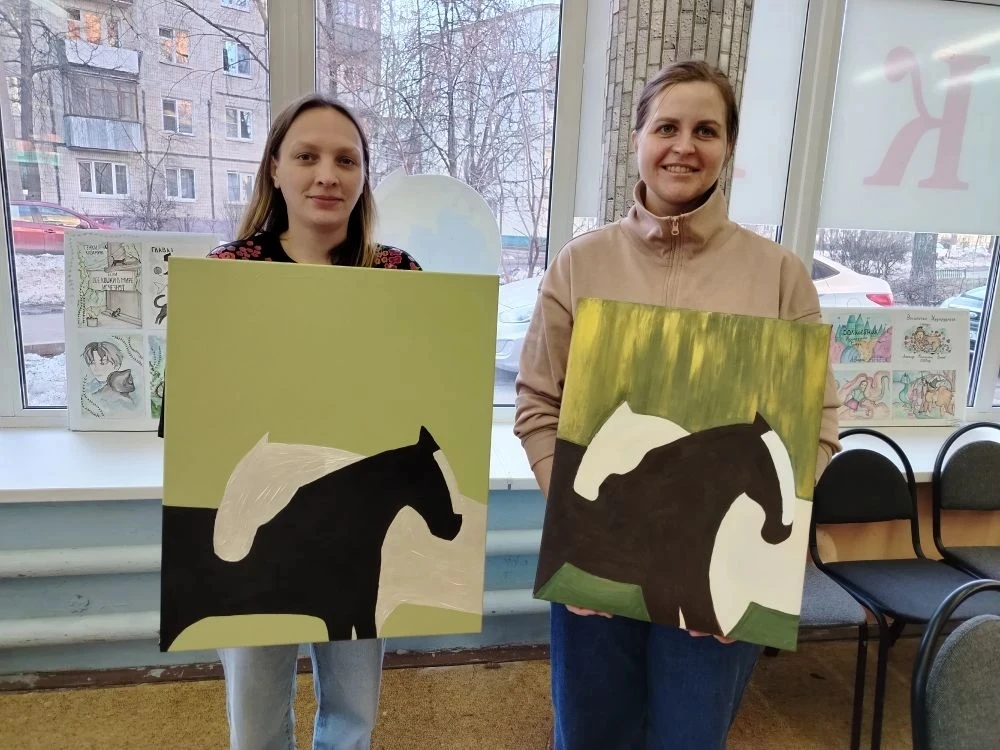 В библиотеке в уютной атмосфере нашего мастер-класса по акриловой живописи на холсте взрослые участники создали трогательную картину: две лошади обнимаются на зелёном фоне! Лаконичный силуэт чёрной и белой лошадей передаёт глубокую душевность образа. Посмотрите на результат! Обнимающиеся лошади – это мощный символ верной дружбы, взаимной поддержки и гармонии в отношениях, напоминая, что настоящая сила рождается в единстве сердец. В поучительном смысле этот образ учит нас: в мире спешки и одиночества стоит помнить о близких, обнимая их душой, как эти грациозные создания, – так мы обретаем внутренний покой и радость. Пусть эта картина вдохновит вас на тёплые объятия с родными!