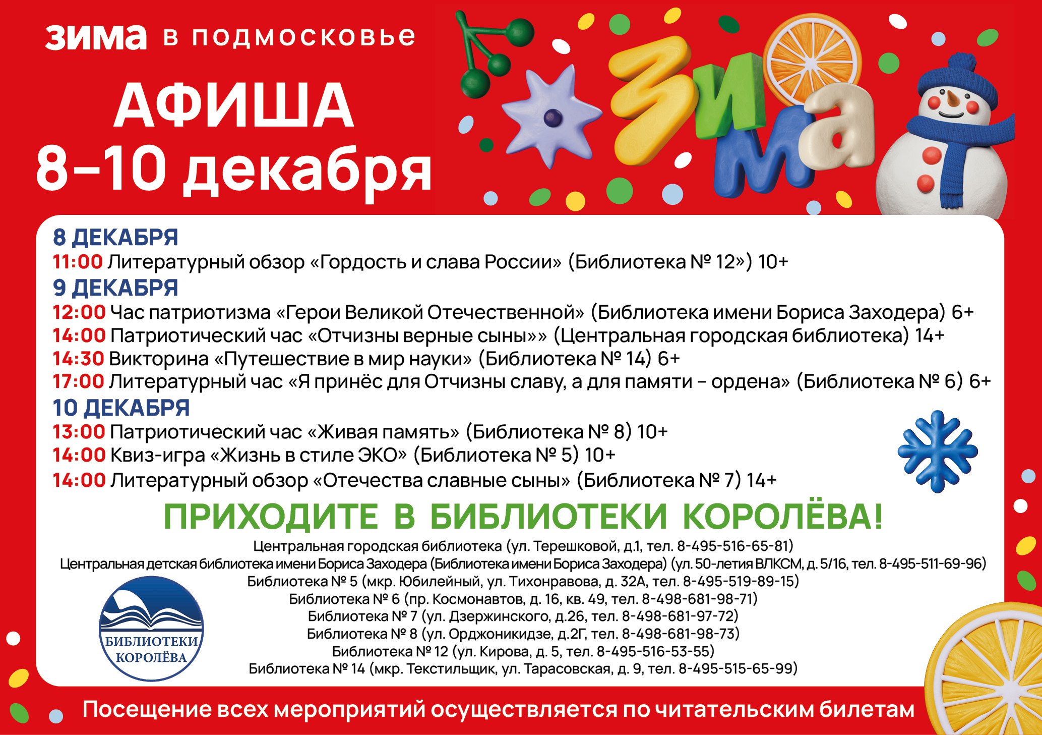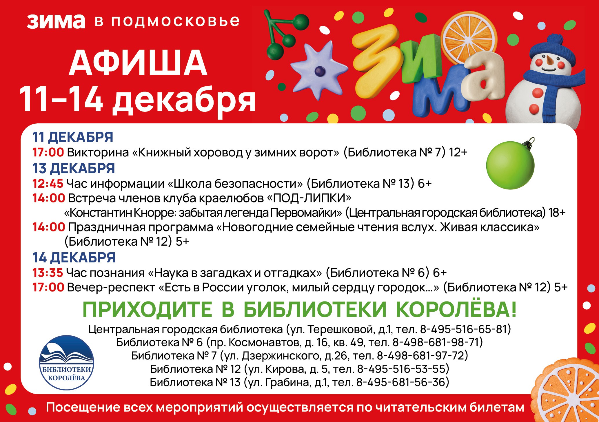 Дорогие друзья! 20 декабря приглашаем на творческую встречу "Чтобы взрослые люди на детство могли оглянуться" с поэтом и краеведом В. Н. Груздевым, лауреатом литературного конкурса им. С. Н. Дурылина, лауреатом и дипломантом Всероссийского конкурса "Гринландия" и дипломантом конкурса им. Роберта Рождественского, членом жюри многочисленных литературных конкурсов. В программе – стихи автора разных лет: о детях и войне, о любви и о мире, о том, что волнует человека сегодня. В качестве музыкального сопровождения запланированы песни и стихи Григория Тачкова – поэта, автора-исполнителя, члена Союза российских писателей и Союза литераторов России. Мероприятие состоится в библиотеке № 7, г. о. Королёв, ул. Дзержинского 26, 2 этаж в 17:00. Вход свободный. Не пропустите!