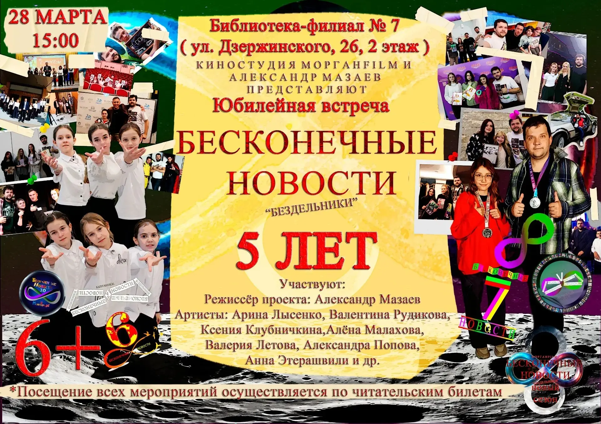 Дорогие друзья! Первый юбилей "Бесконечных новостей" – будем отмечать в библиотеке! 28 марта приглашаем вас на творческую встречу "Бесконечные новости — 5 лет" с насыщенной программой: – Танцы от участников проекта – Юмор от КВН "Бездельники" – Премьерный показ фильмов "Почти сказка" и "Школа Будущего 2" – Встреча с режиссёром Александром Мазаевым – Главное событие – презентация книги-коллекции интервью за 5 лет! Погрузимся в историю "Бесконечных новостей" вместе. Не пропустите! Мероприятие состоится в Библиотеке-филиале № 7, г.о. Королёв, ул. Дзержинского 26, 2 этаж в 15.00.