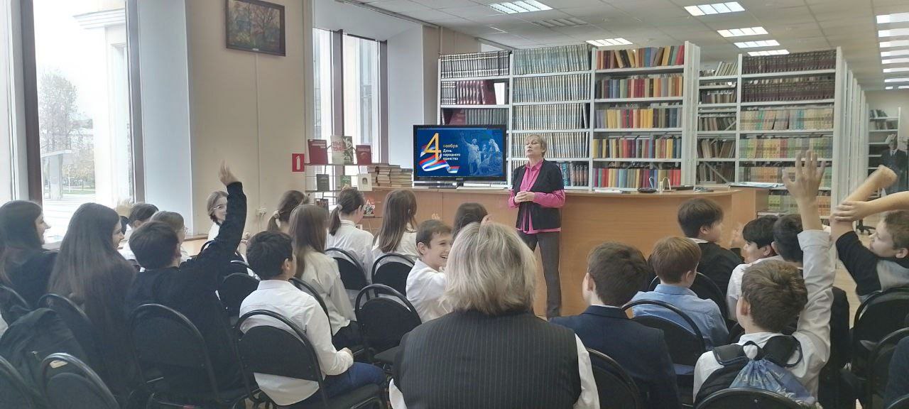 Исторический экскурс "Сила России – в единстве народа" состоялся в библиотеке для учащихся Гимназии № 9, приуроченный к Году защитника Отечества, 1 ноября. Слушателям рассказали о Дне воинской славы России – День народного единства, который ежегодно отмечают 4-го ноября. А также о событиях Смутного времени, о героических подвигах народного ополчения, о единстве и доблести русского народа и о том, что в настоящее время на рубежах специальной военной операции граждане России проявляют героизм и мужество, защищая нашу Родину. К мероприятию была подготовлена книжно-иллюстративная выставка "Книги о великих сражениях".