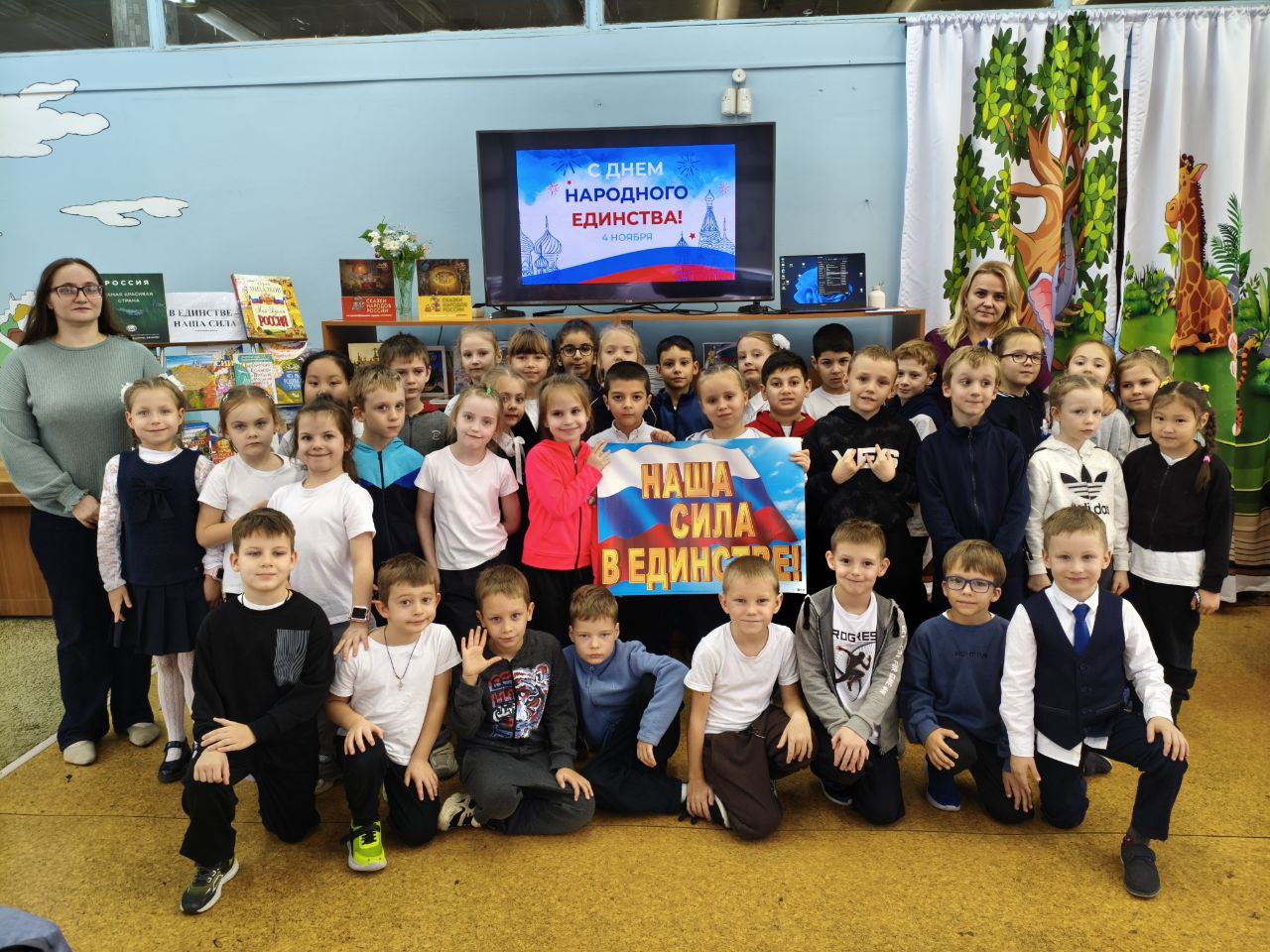 В библиотеке состоялась комплексная программа "Славься, великая, многоязыкая братских российских народов семья", посвящённая Дню народного единства. Сотрудник библиотеки рассказал первоклассникам МБОУ СОШ № 1 о событиях, послуживших причиной рождения праздника, о знаменательных страницах истории Родины, о людях, которые её создавали и отстояли в грозный час. В ходе встречи дети посмотрели мультфильм, помогающий понять, что порознь, поодиночке не сделать того, что можно сделать вместе. Каждый запомнил, что сильна Россия только тогда, когда она едина. Именно поэтому в нашей стране есть такой важный праздник – День народного единства, который отмечался 4 ноября. В ходе мероприятия ребята отвечали на вопросы викторины, отгадывали загадки, вспоминали пословицы и поговорки о Родине, читали патриотические стихи, слушали песни о России.