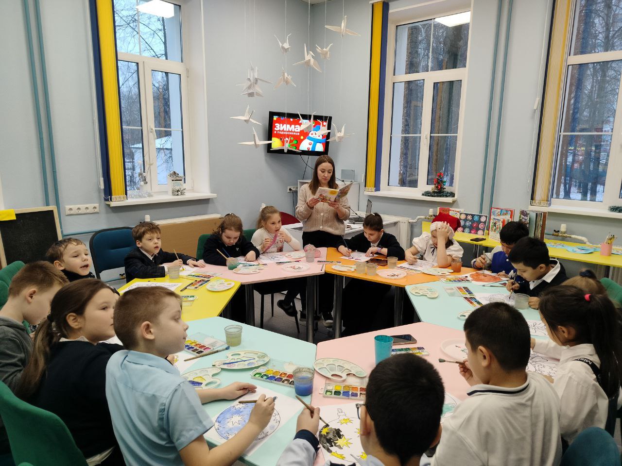 В рамках литературно-изобразительного кружка «Веселая кисточка» сотрудник библиотеки познакомил маленьких читателей с веселым новогодним стихотворением М. Пляцковского «Веселый хоровод», а в технике акварели была создана иллюстрация к данному произведению «Мишка на льду».