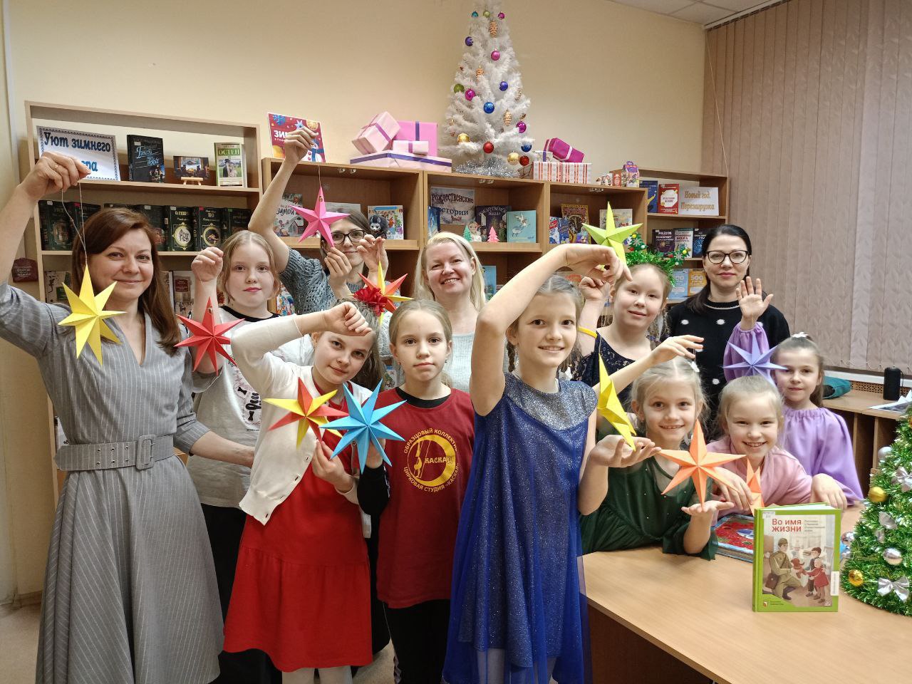 В библиотеке прошёл мастер-класс "В ожидании чуда". Новый год - праздник особый. И взрослым и детям хочется верить, что в наступающем Новом году обязательно случится чудо и произойдёт что-то очень важное и хорошее. Что могло быть лучше и долгожданнее в годы Великой Отечественной войны, чем Победа? Сотрудники библиотеки рассказали юным участникам и их родителям о том, как в военное время отмечали Новый год на фронте и в тылу, какими игрушками украшали ёлку и почему в руках у Деда Мороза было ружьё. Затем каждый из участников сделал из цветной бумаги яркую победную звезду на ёлку.