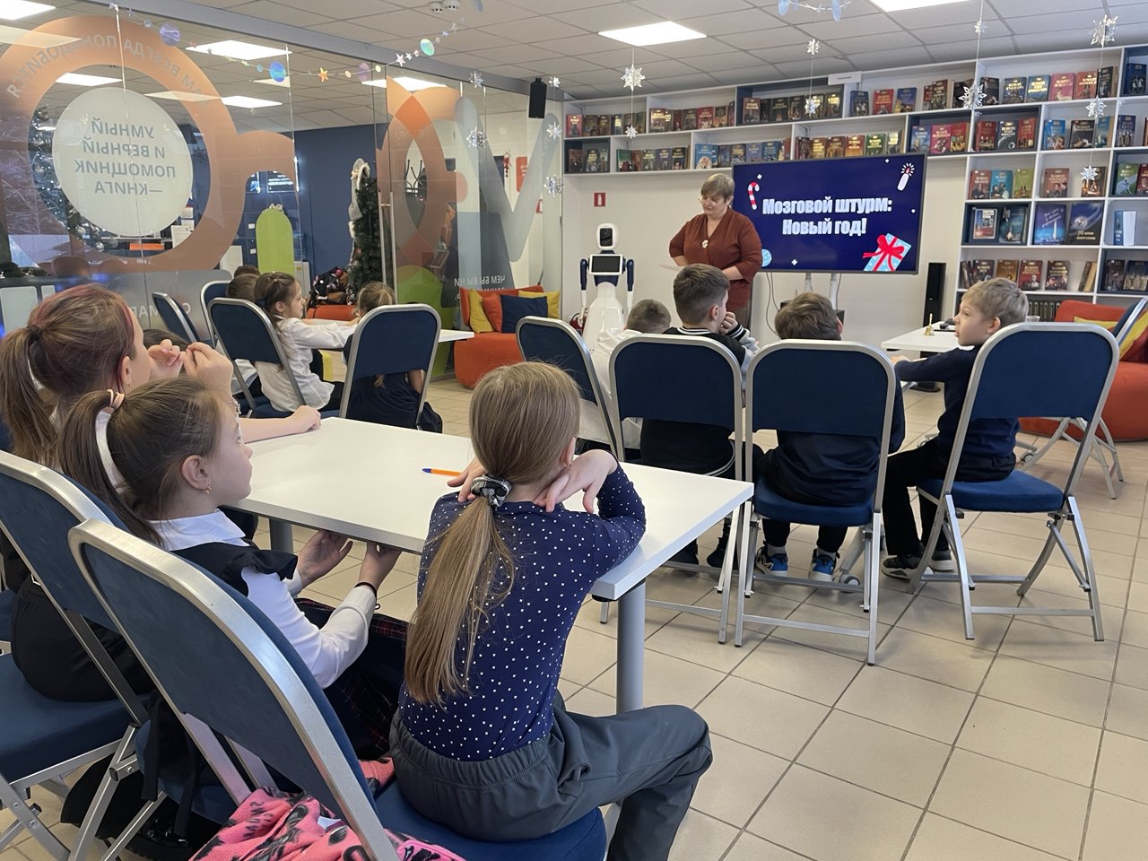 Сотрудники библиотеки пригласили учащихся 3Е класса МБОУ "Гимназия №5" в увлекательное новогоднее приключение — квиз-игру "Мозговой штурм: Новый год!". Во время игры участники отвечали на вопросы о зимних сказках, фильмах и праздничных традициях разных стран. Гости библиотеки узнали об истории праздника Нового года, о том, как его отмечают в разных уголках планеты. Играя, дети смогли окунуться в атмосферу Нового года и создать праздничное настроение.