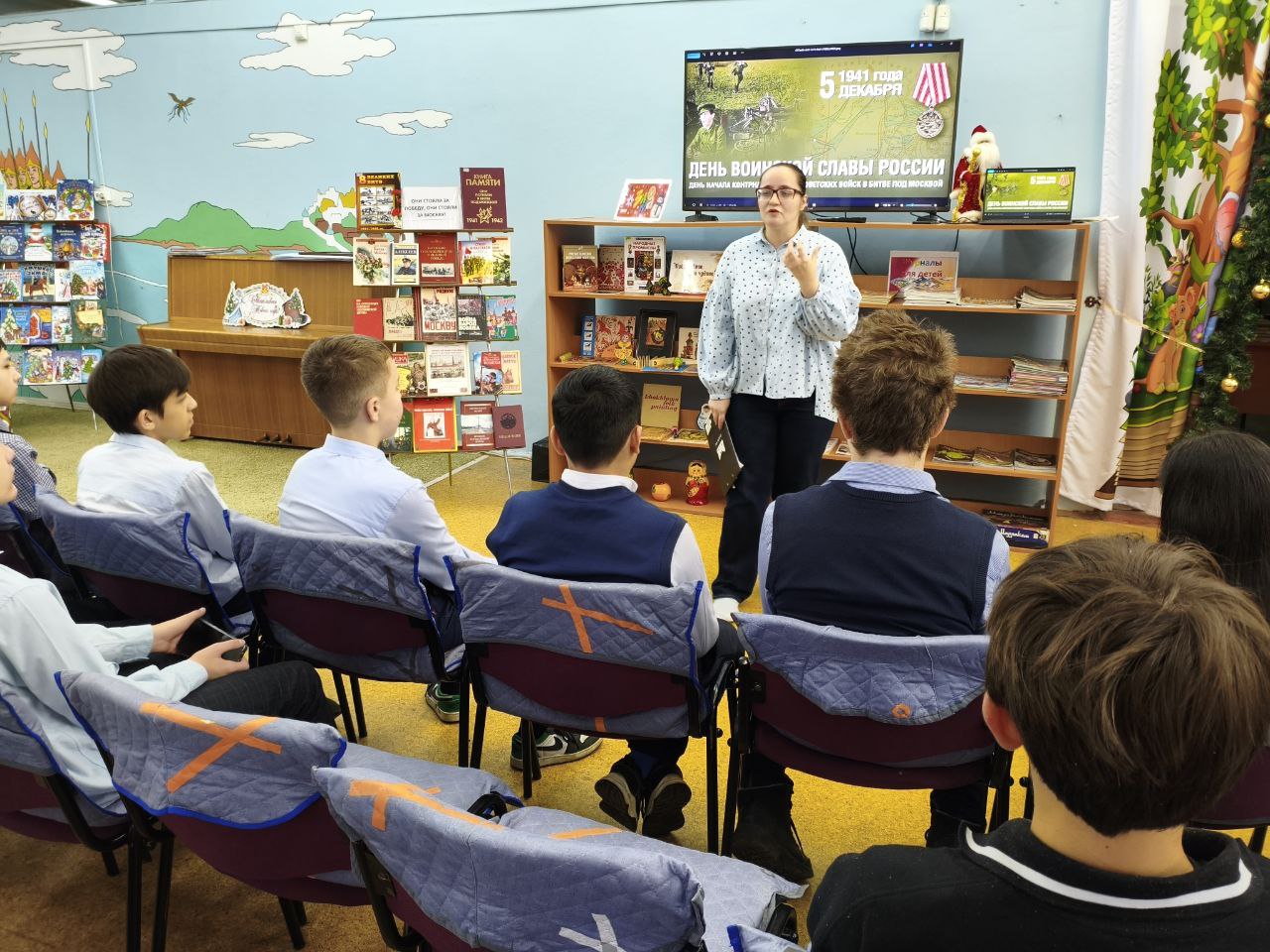 В День воинской славы России слушателям предложили проследить, как были остановлены немецко-фашистские полчища, рвавшиеся к Москве. Библиотекарь рассказала о создании линий обороны, о героях-партизанах, о бойцах-панфиловцах, о первом воздушном таране и о плане контрнаступления генерала Г. К. Жукова, оборвавшем план наступления фашистов "Тайфун".