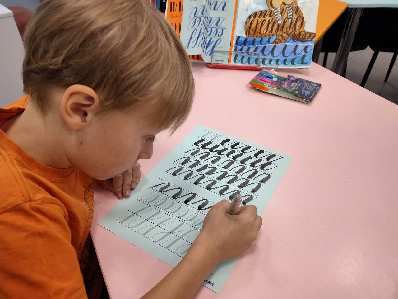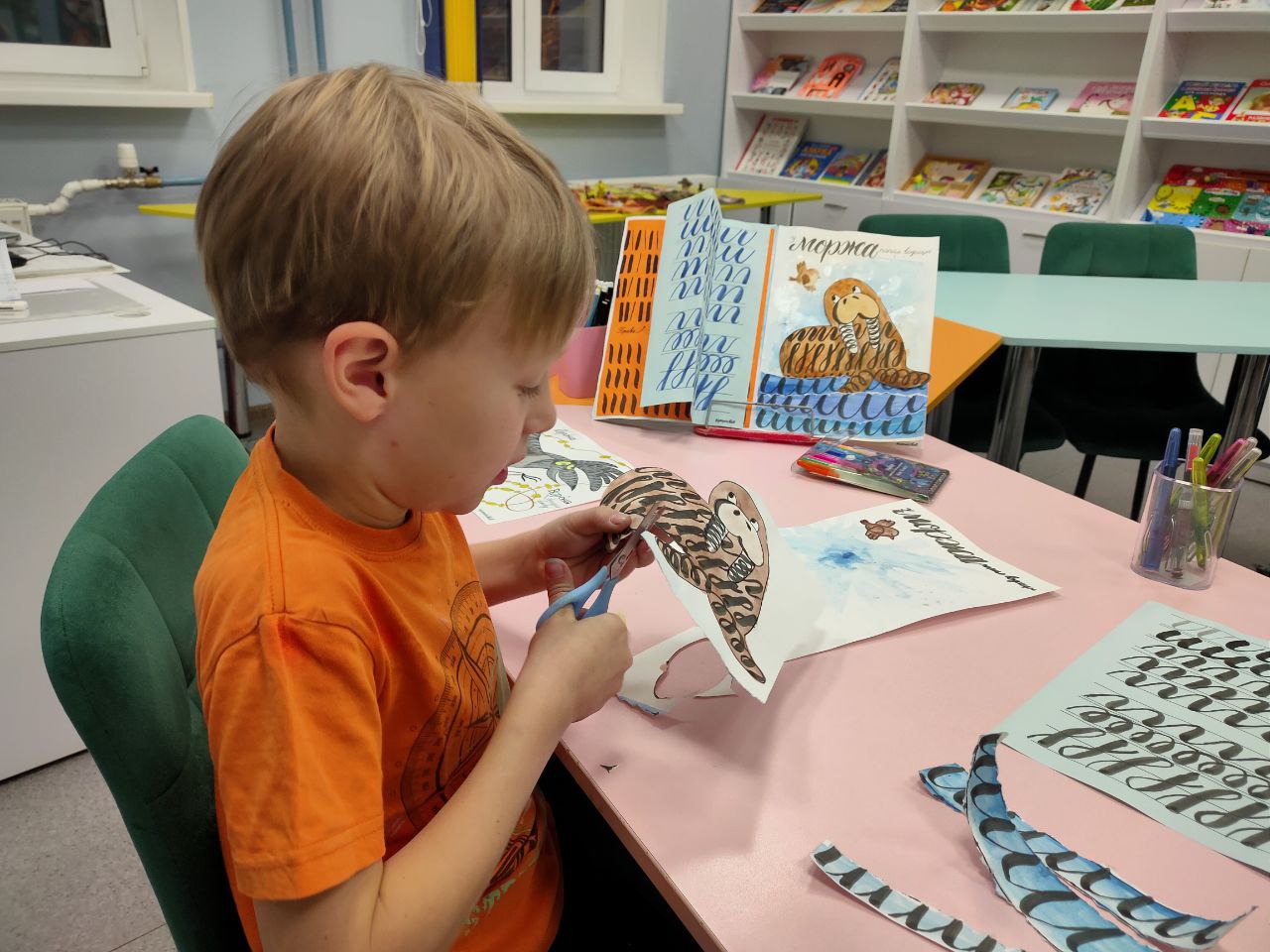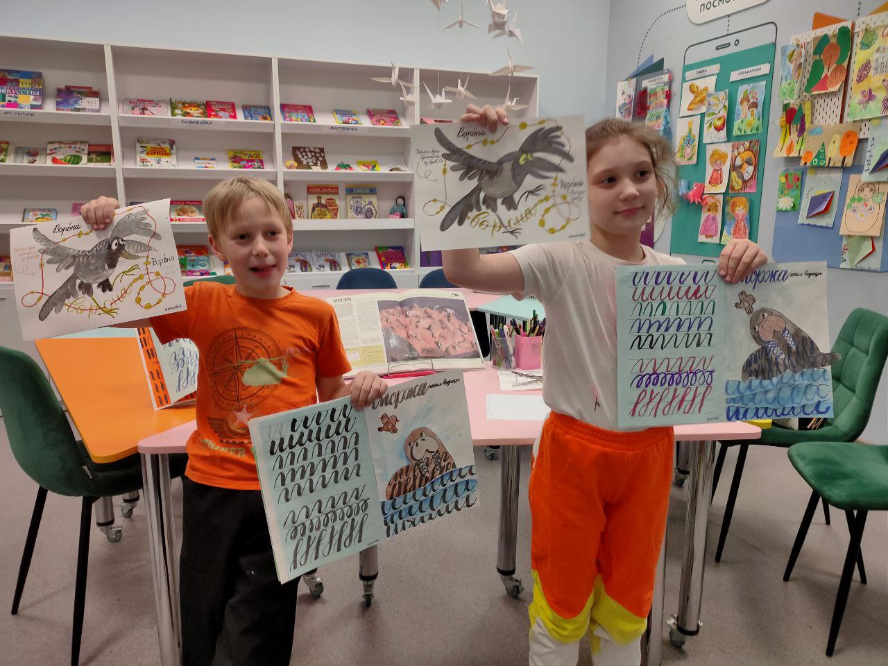 В библиотеке прошло занятие студии игры в каллиграфию "Пишущие ручки". Продолжилось создание детской каллиграфической книги "Где обедал, воробей?" по мотивам стихотворения С. Я. Маршака. В следующем развороте ребята создали моржа, дрейфующего на волнах, и все иллюстрации украшены разнообразием письменных элементов. Сопутствующим заданием стала тренировка словарного слова "ворона". В ходе создания такой творческой работы дети выполняют разнообразные письменные упражнения, которые помогают тренировать руку в каллиграфических элементах, развивать мелкую моторику, улучшать координацию движения руки. А также получать заряд хорошего настроения, ведь готовые работы получаются красивыми и очень привлекательными. "Творить, писать, запоминать, создавать" – девиз нашей творческой студии.