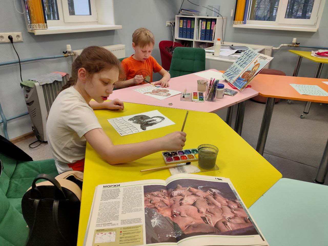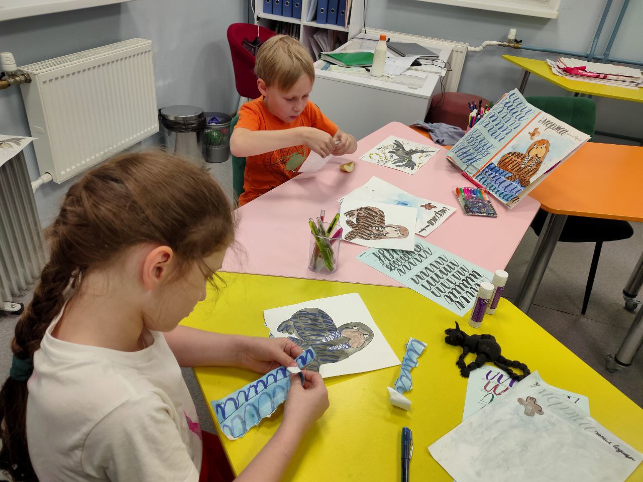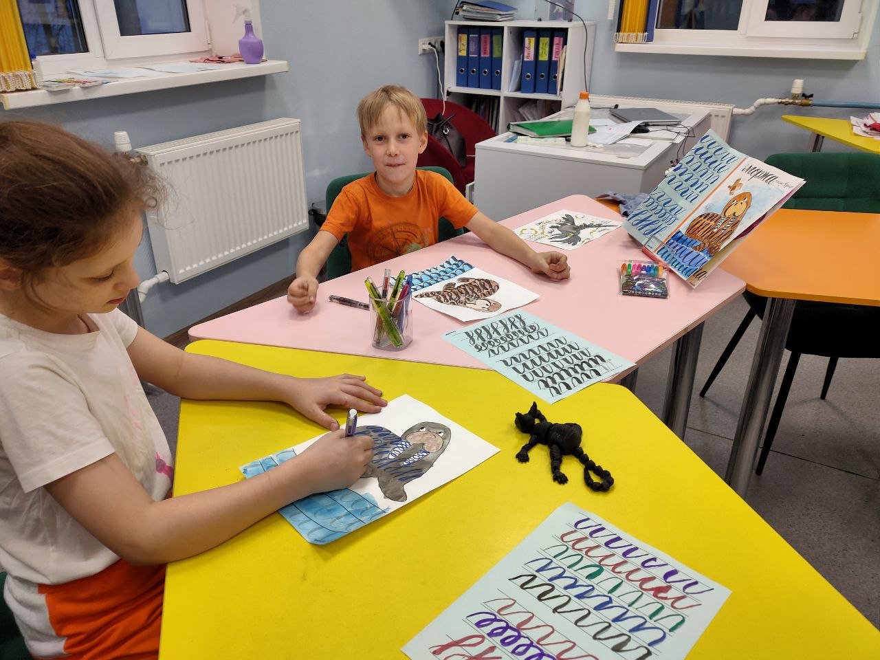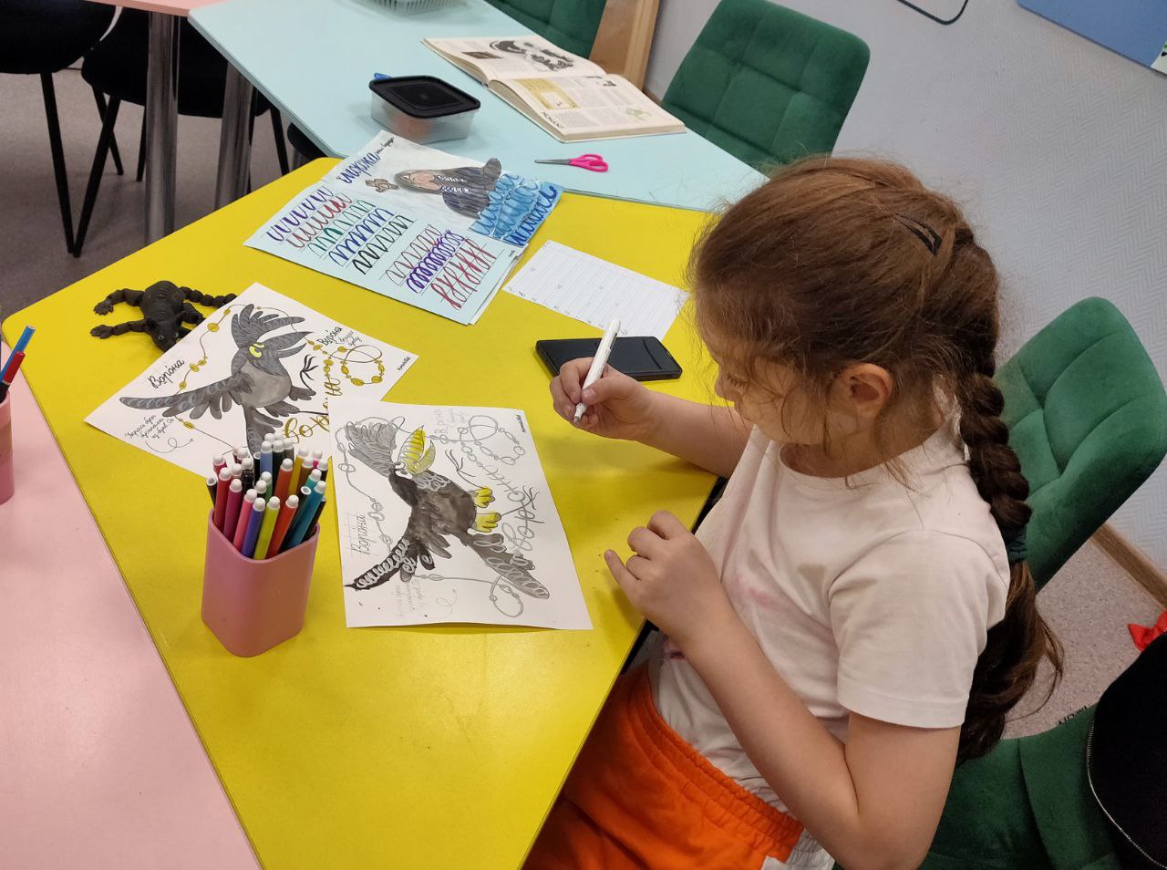 В библиотеке прошло занятие студии игры в каллиграфию "Пишущие ручки". Продолжилось создание детской каллиграфической книги "Где обедал, воробей?" по мотивам стихотворения С. Я. Маршака. В следующем развороте ребята создали моржа, дрейфующего на волнах, и все иллюстрации украшены разнообразием письменных элементов. Сопутствующим заданием стала тренировка словарного слова "ворона". В ходе создания такой творческой работы дети выполняют разнообразные письменные упражнения, которые помогают тренировать руку в каллиграфических элементах, развивать мелкую моторику, улучшать координацию движения руки. А также получать заряд хорошего настроения, ведь готовые работы получаются красивыми и очень привлекательными. "Творить, писать, запоминать, создавать" – девиз нашей творческой студии.