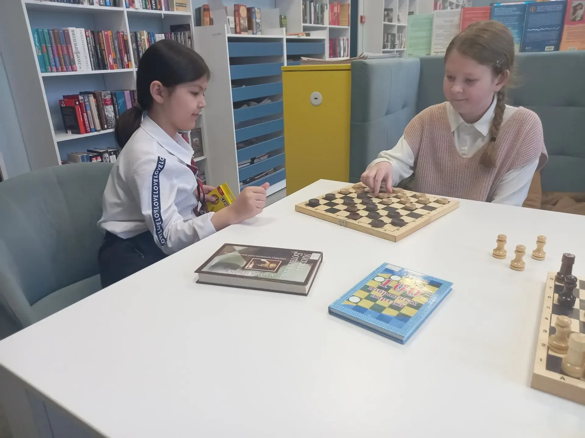 Гости библиотеки посетили клуб любителей шахмат и шашек "Серебряная ладья". Ребята играли в шашки и шахматы и убедились, как интересно и полезно играть в эту древнюю игру. Игра в шашки и шахматы – это одновременно и спорт, и досуг, и творчество. Такие игры воспитывают в детях настойчивость, целеустремлённость, находчивость, внимательность.