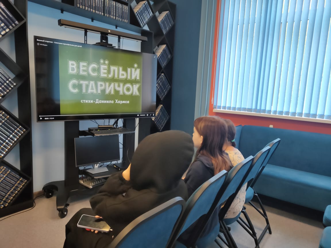 В библиотеке на встрече клуба любителей мультфильмов "Мульти-пульти" был показан мультфильм "Весёлый старичок" по одноимённому стихотворению Даниила Хармса. В мультфильме рассказывается о никогда не унывающем старичке маленького роста, который всё время смеялся. Однажды он решил поймать стрекозу, но, не рассчитав, сам попал в свой собственный сачок. Воспользовавшись этим, стрекоза подняла его вверх и сбросила, причём он спустился в паутину, используя колпак в качестве парашюта. Пытаясь уклониться от паука, главный герой в ходе весёлых прыжков распутал паутину, и паук упал вместе с ним. Видя, как от смеха старичка резонирует вся растительность, паук сошёл с ума. Далее старичок продолжает смеяться до слёз.