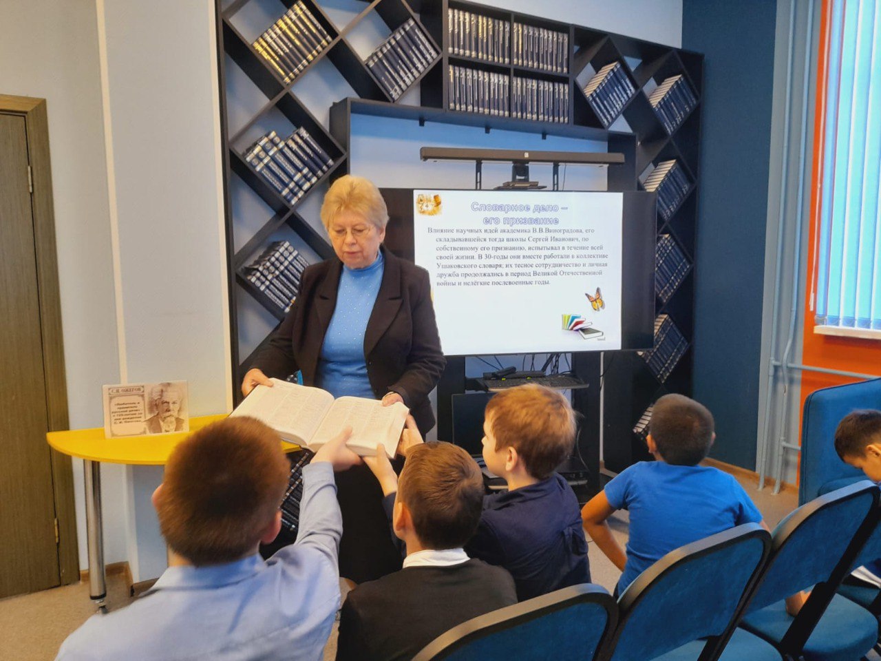 Учащиеся узнали, что имя Сергея Ивановича навсегда вошло в историю российского языкознания, а основные труды посвящены русской лексикологии и лексикографии, истории русского литературного языка, социолингвистике, культуре русской речи, языку отдельных писателей – А. С. Пушкина, И. А. Крылова, А. Н. Островского. С. И. Ожегов – один из составителей "Толкового словаря русского языка" под редакцией Д. Н. Ушакова, автор однотомного "Словаря русского языка", выдержавшего несколько переизданий ещё при жизни составителя. Сергей Иванович часто выступал с публичными лекциями и на страницах массовых изданий, был редактором "Орфографической словаря русского языка", нескольких словарей-справочников; под его редакцией выходили интереснейшие сборники "Вопросы культуры речи".