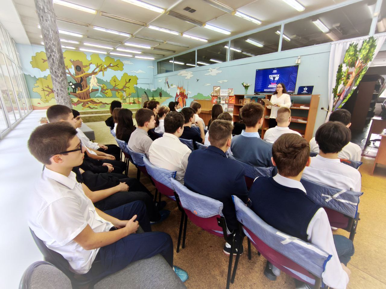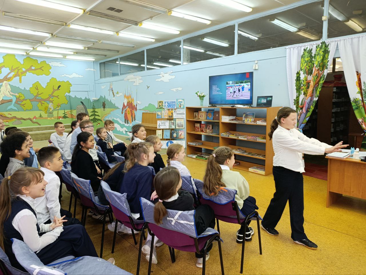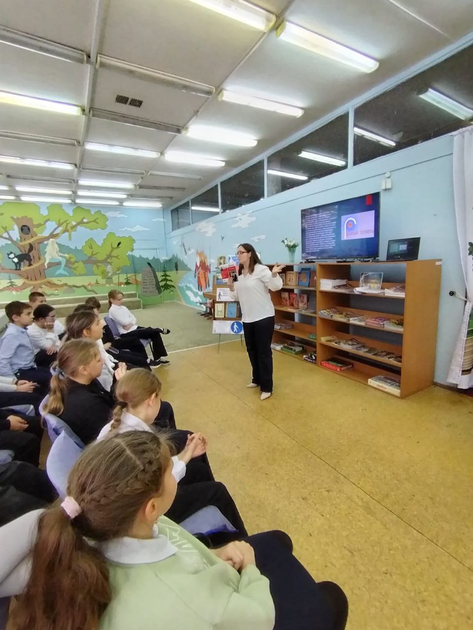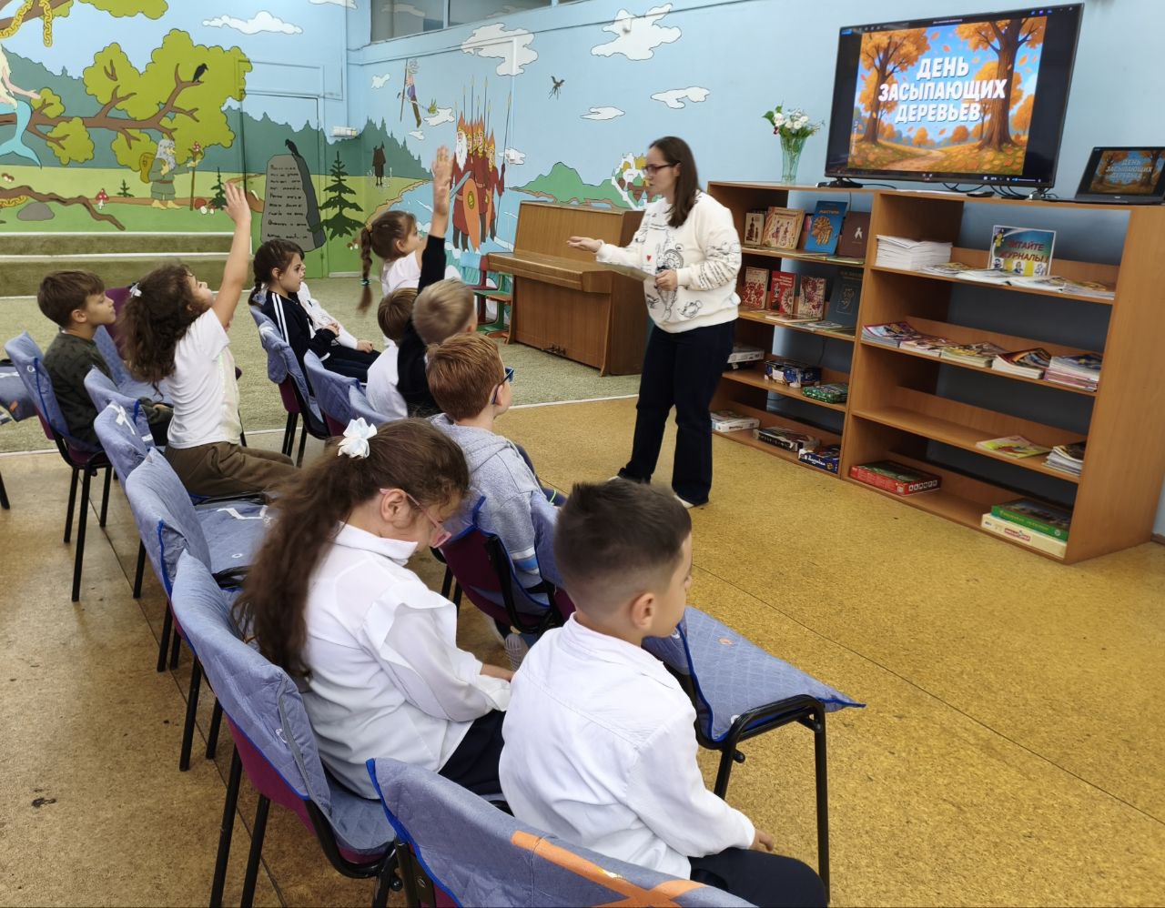В День засыпающих деревьев, когда природа тихо готовится к зимнему сну, библиотека встречала ребят из МБОУ СОШ № 1. Здесь, среди книжных полок, школьников ждало увлекательное путешествие в мир осенних преображений. Звучали звонкие детские стихи и добрые рассказы об осени, а перед глазами школьников проплывали яркие картины из осенних листьев знакомых деревьев. Загадки кружились в воздухе, словно первые опавшие листья, а за каждый правильный ответ ребята получали резной кленовый листок для украшения дерева знаний. Считается, что именно с этого дня деревья облачаются в свои последние багряно-золотые наряды и начинают ронять листву, погружаясь в долгий, зимний сон. Праздничное настроение поддерживали осенние песни и красочная презентация, посвященная волшебству увядающей природы. Встреча проходила в рамках системного расписания.