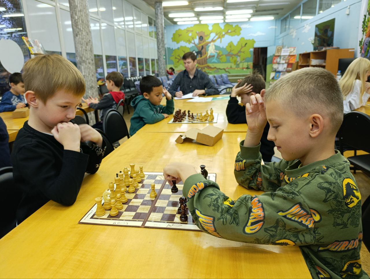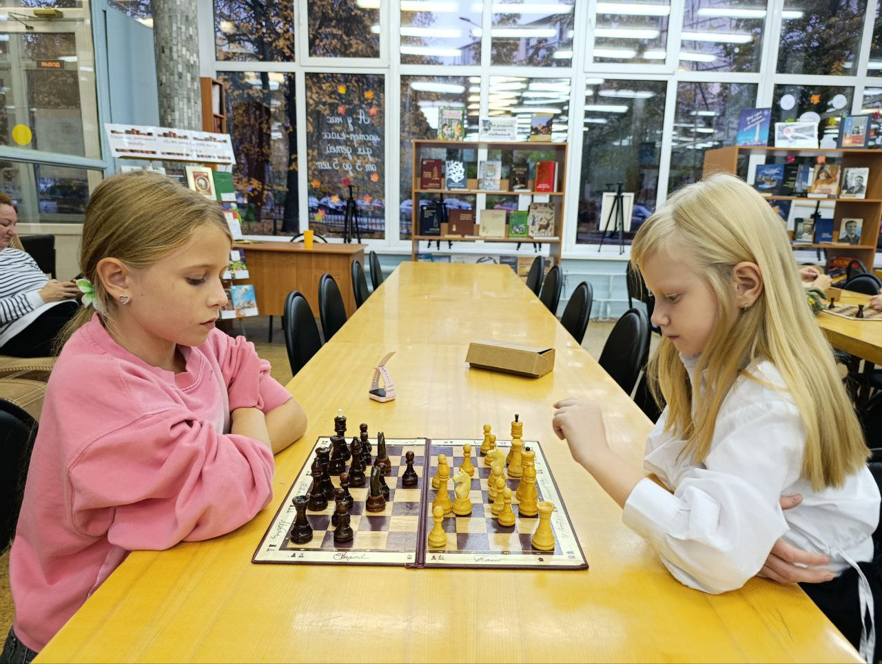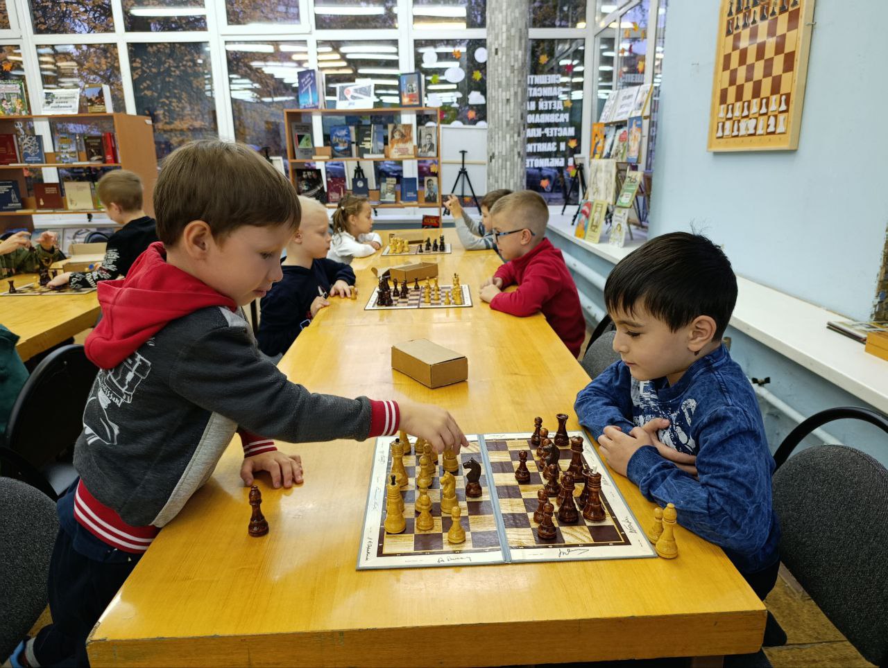 В библиотеке состоялось очередное занятие клуба любителей шахмат "Белая ладья". Перед началом занятия юные читатели познакомились с детским журналом "Отчего и почему", а после этого сразились между собой в интересных захватывающих шахматных партиях.