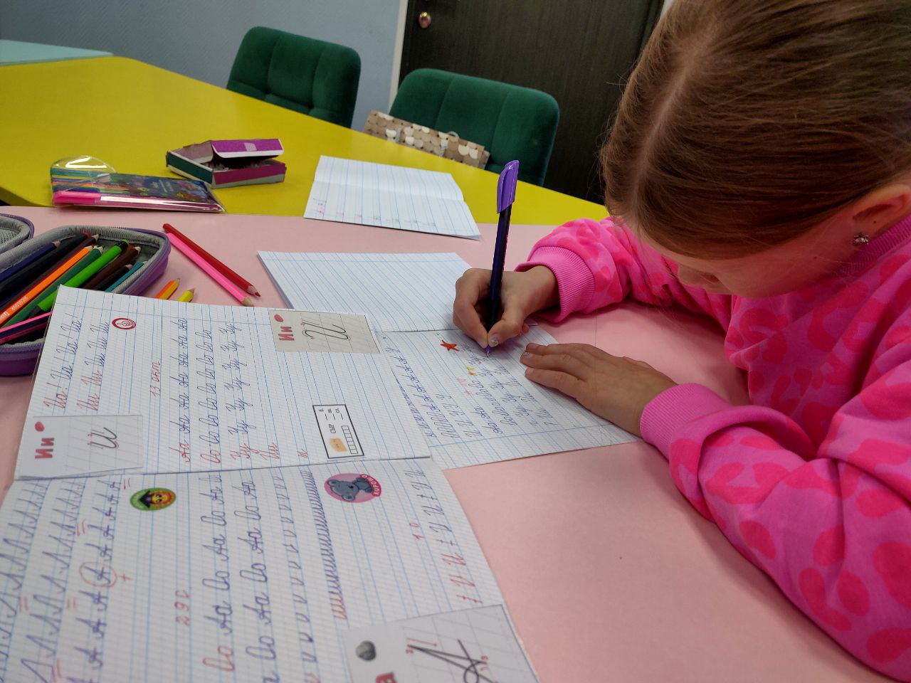 В библиотеке прошло занятие студии игры в каллиграфию "Пишущие ручки". Мы вспомнили и повторили написание пройденных букв "Аа, Оо, Уу, Ии, ы", после чего перешли к новой букве "н" строчная. Используя опоры на рабочую строку и вспомогательные линии разобрали из каких элементов состоит буква, её безотрывное написание и соединение. Так ребёнок получает понимание как писать букву – это является фундаментом для читаемого аккуратного почерка. В завершении, выполнили творческое задание, которое служит мотивацией и помогает отработать элементы букв, работу с ритмом и точность движений.