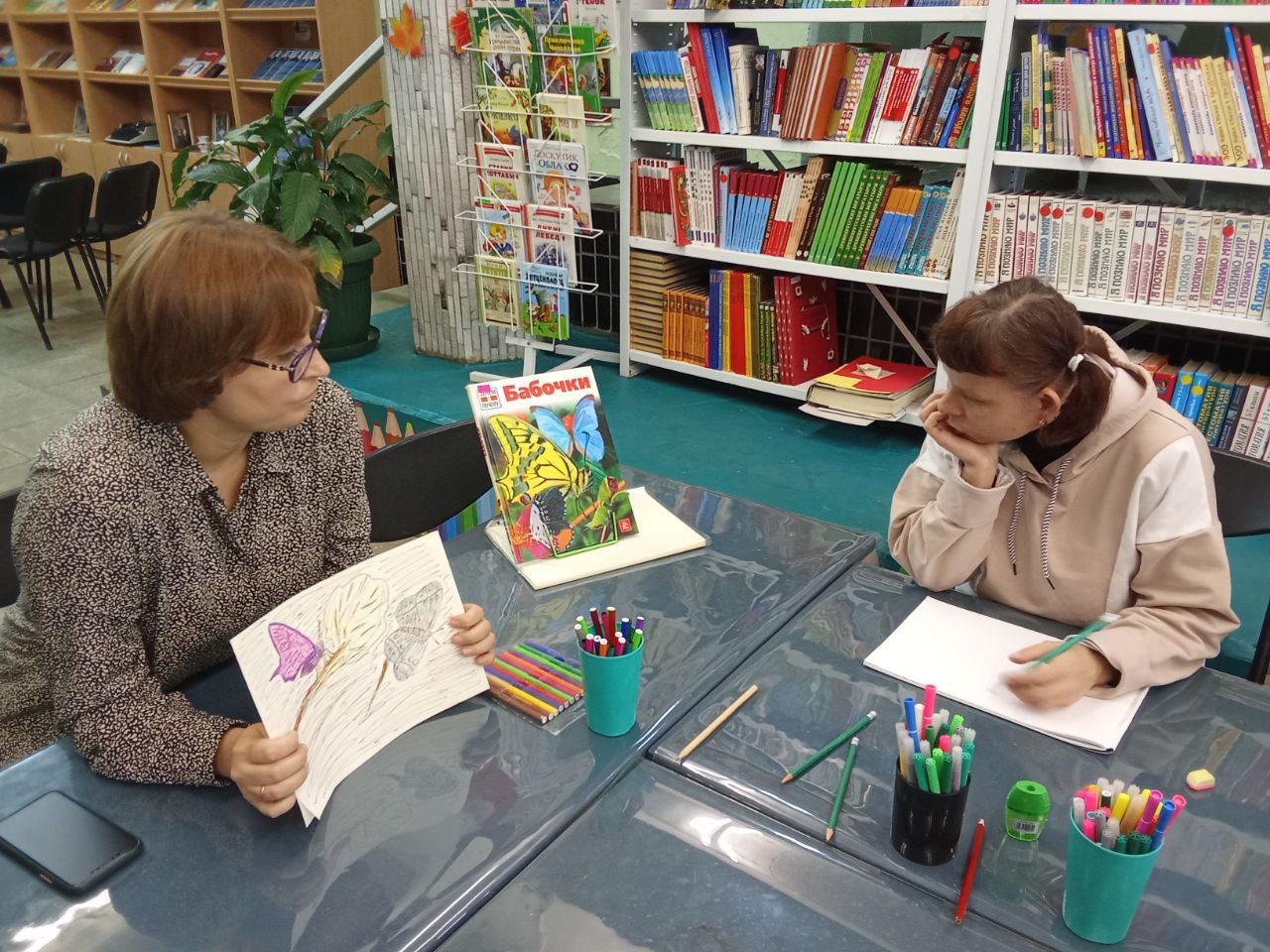 На занятии под руководством сотрудника библиотеки ребята делали поделки, параллельно узнавая о том, какими бывают бабочки, откуда они появляются, сколько живут и почему имеют определённый окрас.