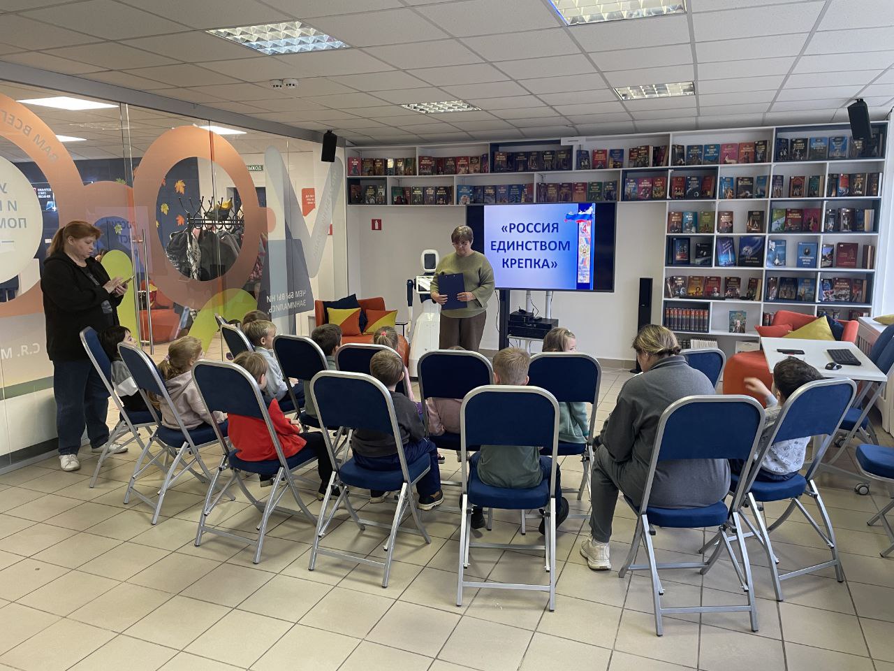Сотрудники библиотеки пригласили воспитанников старшей группы "Радуга" МБОУ "Гимназия № 3 имени Л. П. Данилиной" дошкольного отделения на час исторической памяти "Россия единством крепка".