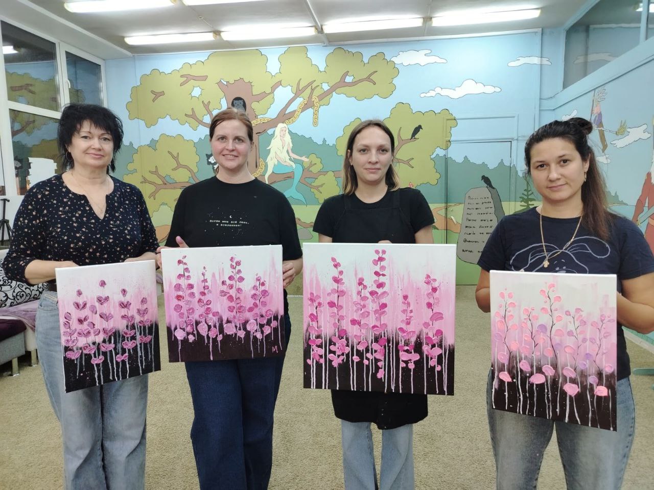В библиотеке прошёл мастер-класс по рисованию акриловыми красками интерьерной картины с объёмными цветами. Вместе с родителями наших читателей мы окунулись в мир текстуры и цвета! Сначала мы волшебным образом создали на холсте фон – от нежного светло-розового до глубокого таинственного черного. А потом настало время главного действа – рисования мастихином! С помощью этого профессионального инструмента мы написали сочные, фактурные цветы, которые буквально оживали на холсте. Каждая работа получилась уникальной, наполненной теплом и совместным творчеством. Теперь в наших домах появится не просто картина, а настоящая семейная реликвия, созданная своими руками!