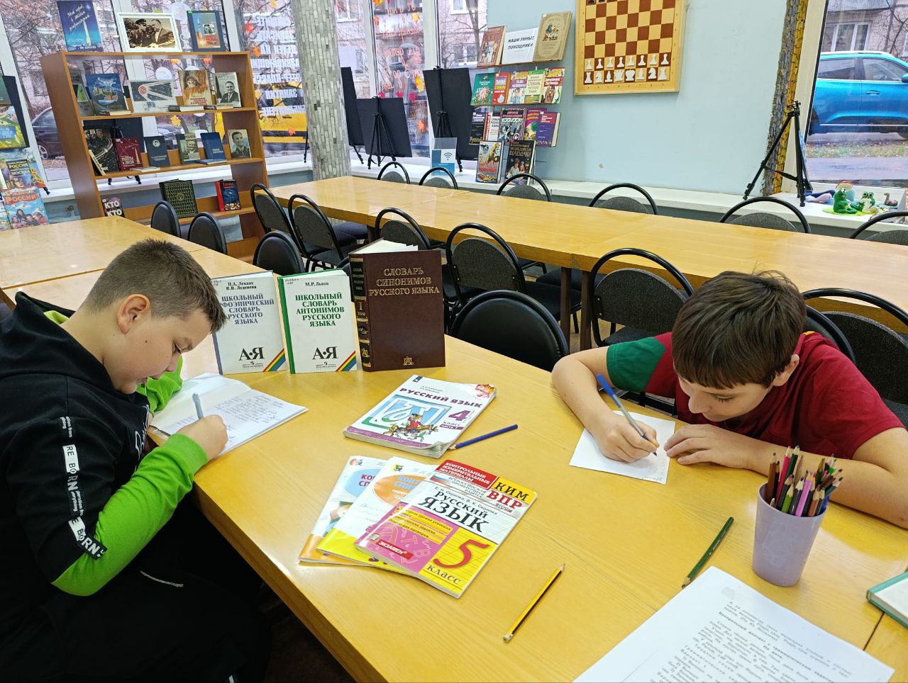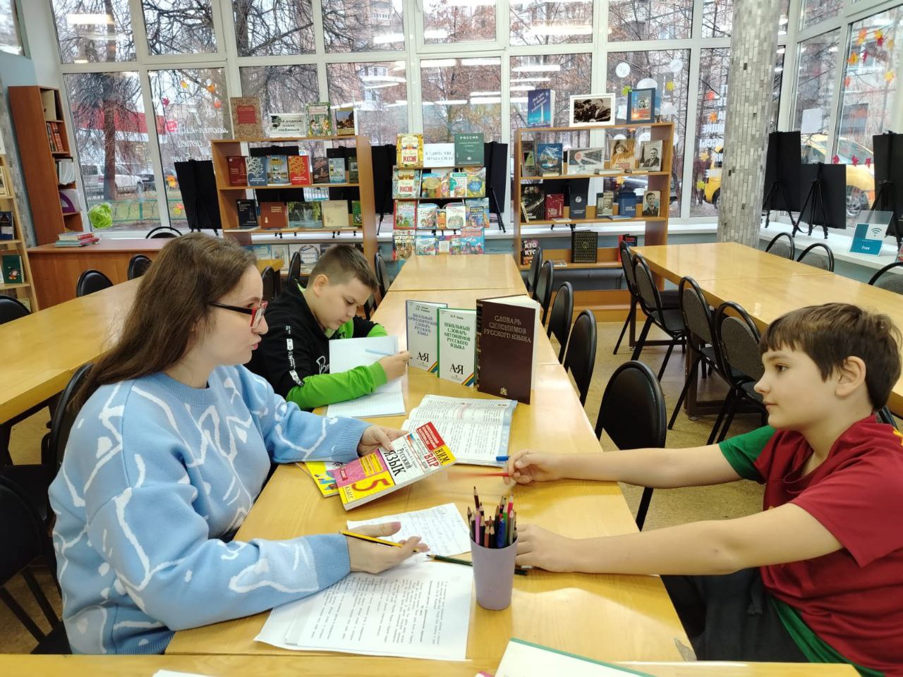 В библиотеке в рамках мастер-класса "Отличник" ребята разных возрастов повторяли трудные для них темы русского языка, выполняли задания по фонетике, орфографии, знакомились с разнообразием словарей из фонда библиотеки.