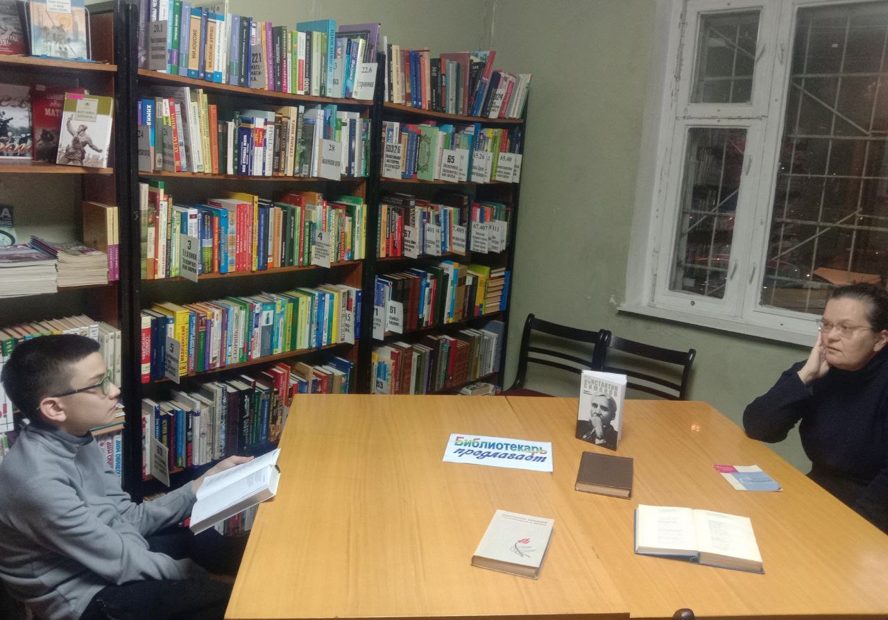 28 ноября 2025 года исполняется 110 лет со дня рождения Константина Михайловича Симонова. Накануне дня рождения в библиотеке состоялся литературный час "От сердца к сердцу", посвящённый поэту, прозаику и публицисту Константину Симонову. На встрече ведущая познакомила присутствующих с жизнью и творчеством писателя. Его жизнь и творчество – явление масштабное, неординарное. Он был писатель неограниченного размаха: поэт, прозаик, публицист, драматург, кинодраматург с мировым именем. Константин Михайлович был выдающимся деятелем советской литературы и культуры. В качестве депутата Верховного Совета СССР и РСФСР, Симонов активно участвовал в международном движении за мир. Он также занимал должность главного редактора таких значимых изданий, как "Литературная газета", и журнал "Новый мир". Из встречи присутствующие узнали, что судьба писателя складывалась непросто. Она преподнесла ему, немало сложных испытаний, но он выдержал их достойным образом и ушёл из жизни бойцом, до конца выполнивший свой гражданский и военный долг.
