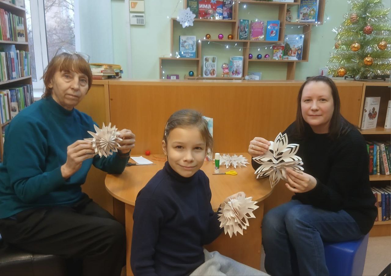 В библиотеке в творческой мастерской "Бумажная академия" участники попытались сделать снежинку из бумаги, так как настоящего снега пока нет. Внимание участников привлекли модели многослойные и объёмные, над которыми пришлось изрядно потрудиться, но результат всех порадовал – ведь умелые руки могут делать и такие чудеса.