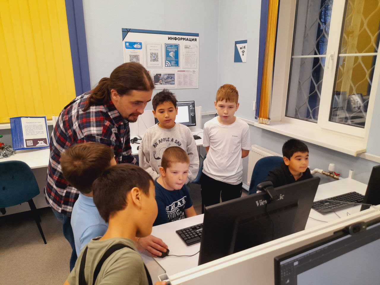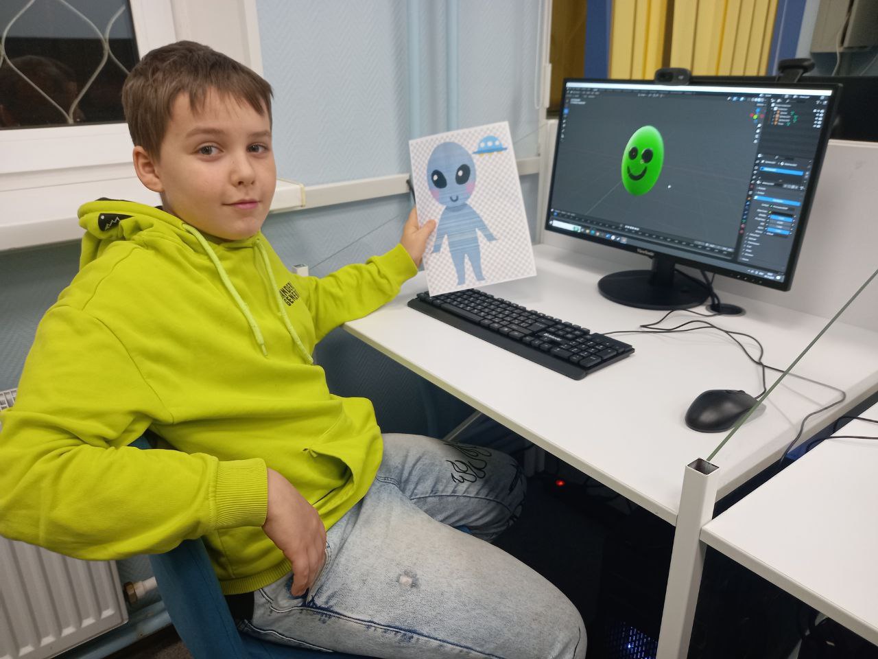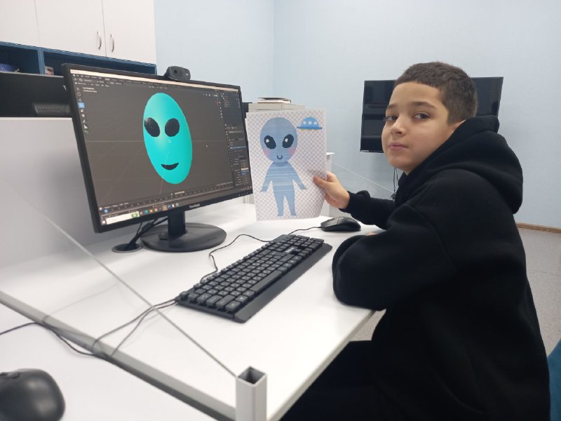 В библиотеке прошло занятие курса по изучению редактора трёхмерной графики Blender "Войти в IT". Сотрудник библиотеки познакомил ребята с интерфейсом и простейшими инструментами программы: добавлением и преобразованием простейших фигур, а также – с тем, как их раскрашивать. Для закрепления навыков ребята смоделировали голову инопланетянина.