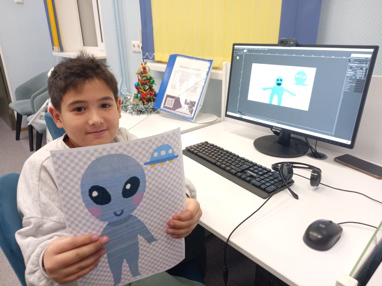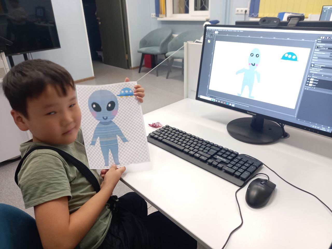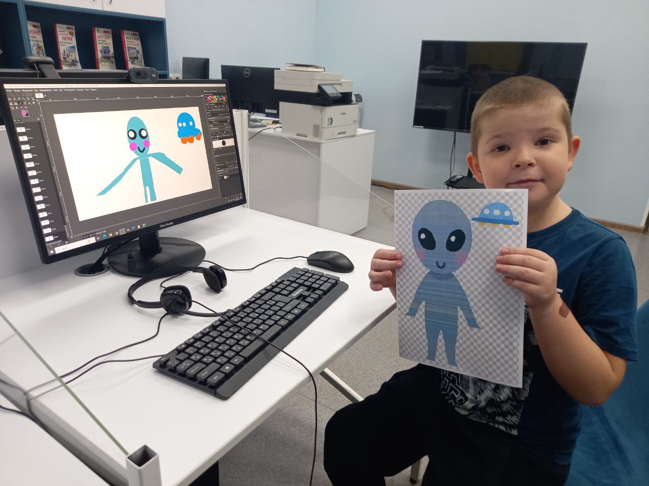 В библиотеке прошло занятие курса по изучению графического редактора GIMP "Gimpики". Сотрудник библиотеки познакомил ребята с интерфейсом и простейшими инструментами программы – кистью, палитрой и выделением. Для закрепления навыков ребята нарисовали инопланетянина.