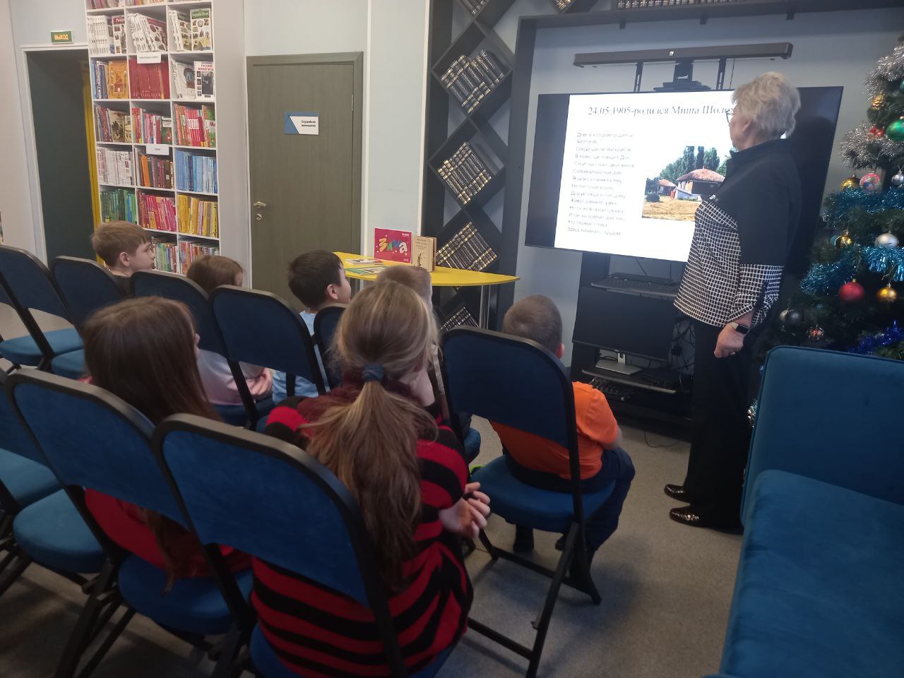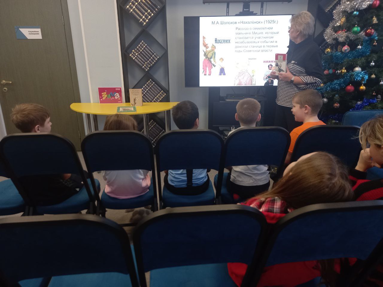 В библиотеке прошёл литературный час для любителей "Клуба "К.О.Т" (Книги. Общение. Тусовка) на тему "Юбилей у Нахалёнка". В начале мероприятия сотрудник библиотеки рассказала детям о жизни и творчестве М. А. Шолохова. Затем участники мероприятия отправились в литературное путешествие по рассказу Михаила Александровича Шолохова "Нахалёнок". В ходе мероприятия зачитывались отрывки из рассказа "Нахалёнок". Ребятам очень понравился рассказ, они оценили непревзойдённый донской юмор Михаила Шолохова, а также его любовь к землякам и к родной земле. После прочтения отрывков из рассказа учащиеся отвечали на вопросы библиотекаря, включающие обсуждение, например, как относятся окружающие к "Нахалёнку", какие черты характера присущи главному герою, почему Мишка хотел вступить в армию, за что и с кем воевал Мишкин отец?