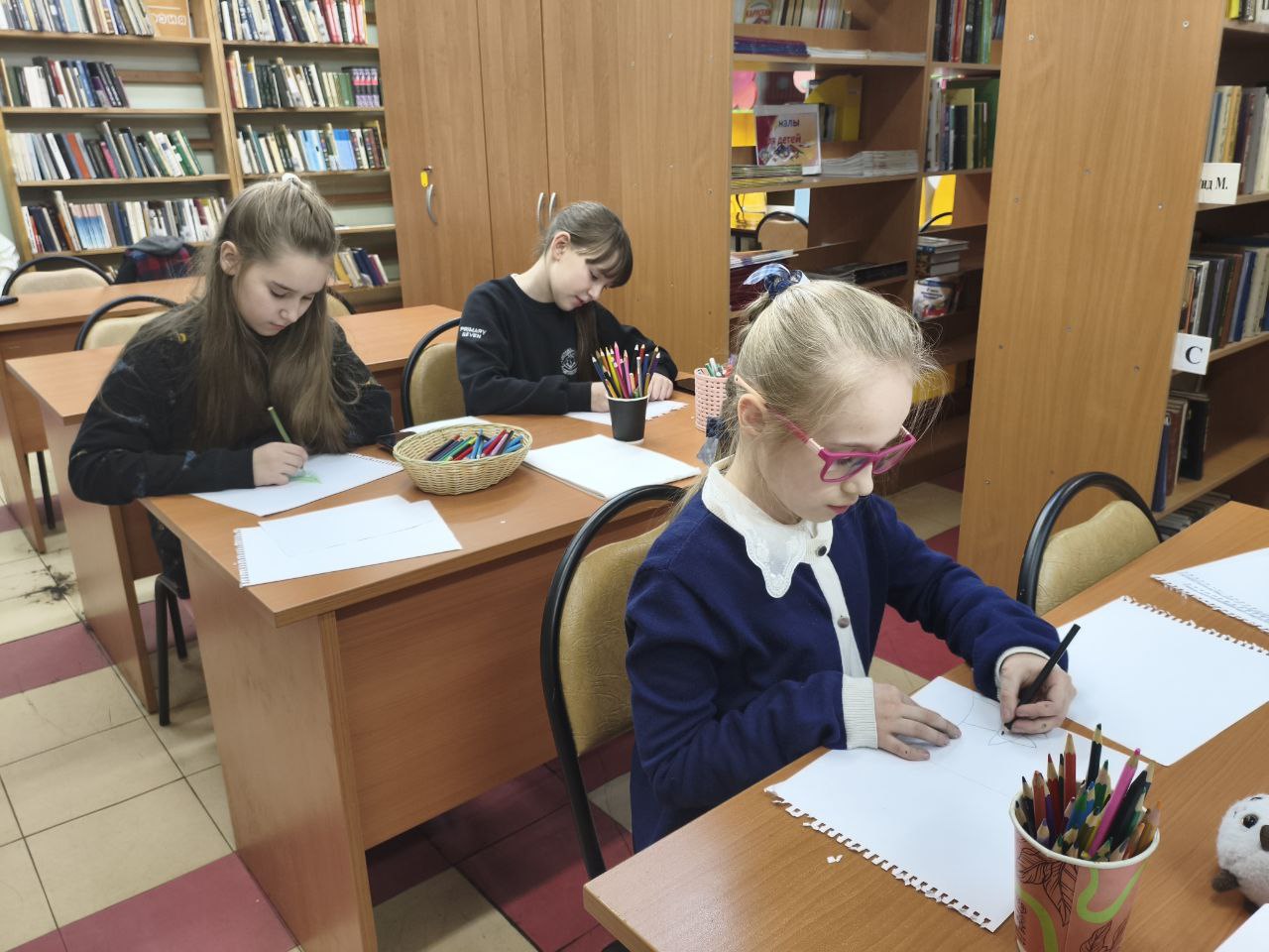 Как же дети любят участвовать в творчестве взрослых! Их тут же охватывает желание присоединиться к общему делу. В библиотеке после уроков школьники с азартом помогают украшать помещение и создают яркие картины, посвящённые матушке-зиме.