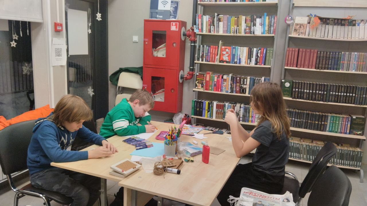 в библиотеке в творческой мастерской по изготовлению очаровательных подарков ребята шили рождественские звёздочки, плели в стиле макраме сердечки и новогодние ёлочки с разноцветными бусинками, рисовали зимние пейзажи, используя светящиеся краски в темноте. Вспоминали новогодние стихи и пели песенки про Новый год.