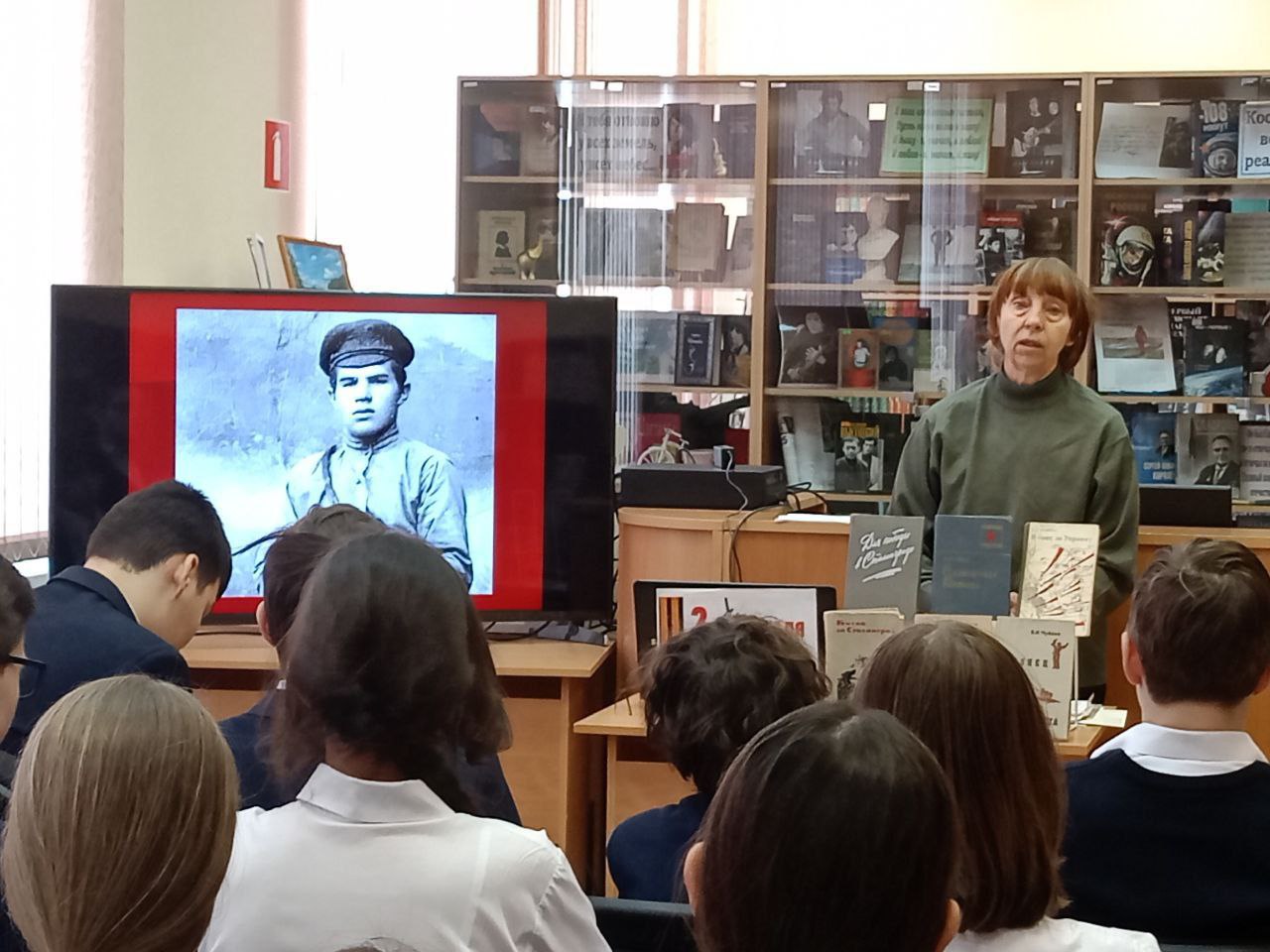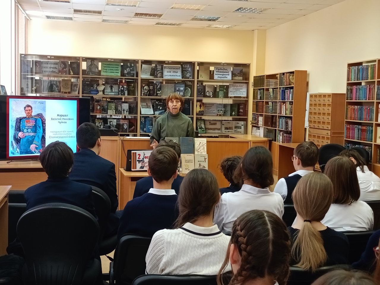 Сотрудники библиотеки рассказали о сражении, ознаменовавшем начало коренного перелома в ходе Великой Отечественной войны, о Сталинградской битве, о героизме советских людей, защитивших в смертельной схватке с врагом Сталинград, о том, как развивалось начатое затем контрнаступление советских войск, как была окружена и разгромлена огромная 330-тысячная фашистская армия гитлеровского генерал-фельдмаршала Паулюса.