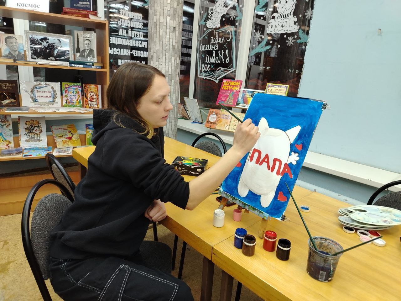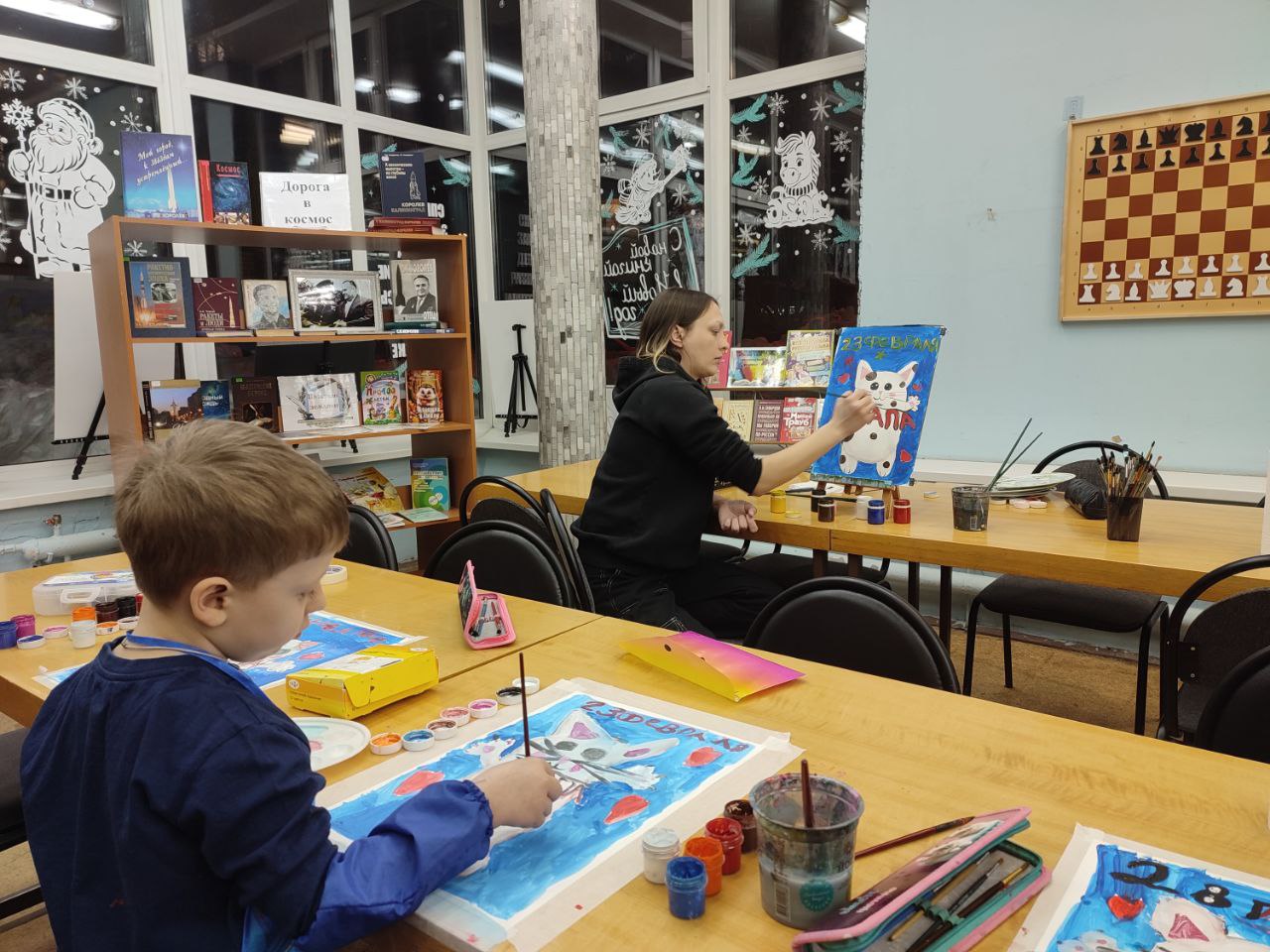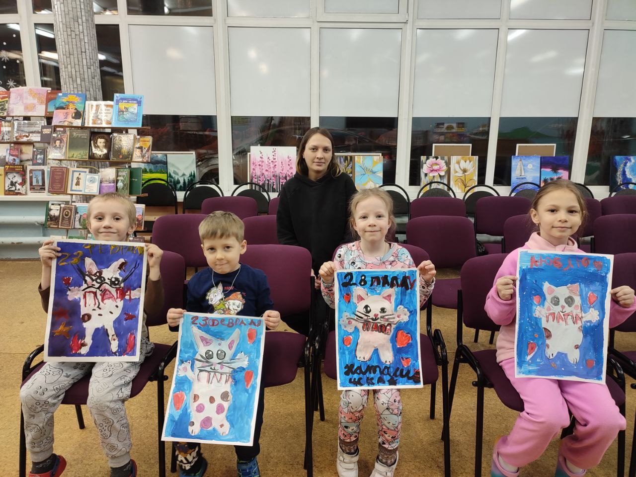 В библиотеке прошёл кружок по рисованию на котором мы рисовали открытку "Папин котик" для 23 февраля! В нашем уютном уголке творчества, где краски оживают, малыши 5 лет нырнули в волшебство гуаши! Сегодня их пальчики оживили милого белого котика с забавными пятнышками. А в пушистых лапках котёнок держит ленточку с нежными словами "Папа". Каждый мазок кисти развивал чудо моторики: детки учились держать инструмент уверенно, смешивать цвета, как алхимики, и аккуратно наносить пятнышки – это гимнастика для пальчиков, которая делает ручки ловкими и сильными! А воображение расцветало буйным садом: малыши придумывали истории о котике, выражали любовь к папе через яркие краски, развивая эмоциональный интеллект и речь. Тонкие линии учили концентрации и точности, а смешение белого с цветными пятнышками – чувствовать гармонию оттенков, пробуждая художественное чутьё!