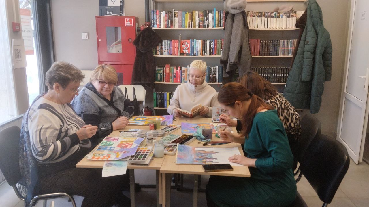 В библиотеке прошло занятие студии живописи "Краски жизни" для читателей старшего поколения в технике правополушарного рисования "Зимний пейзаж". Мастер-классы по правополушарному рисованию – это занятия, направленные на обучение технике, которая задействует преимущественно правое полушарие мозга, отвечающее за воображение, интуицию, эмоции и образы. Основная идея правополушарного рисования заключается в том, чтобы погрузиться в творческое состояние и посмотреть на окружающий мир с другого ракурса. Это отличная возможность для взрослых выразить свои эмоции и идеи через искусство. Участники мероприятия остались довольны и свои рисунки забрали с собой.