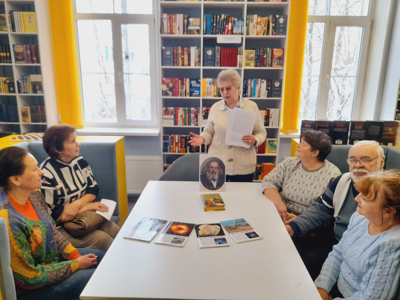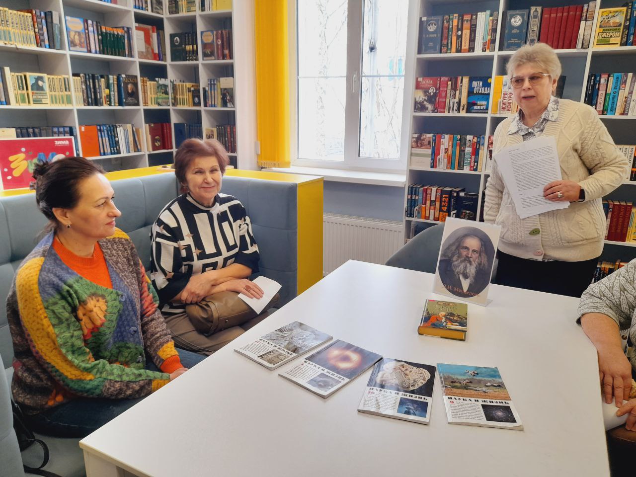 В библиотеке ко Дню Российской науки прошла встреча на тему "Великое имя – Менделеев". Библиотекарь интересно и увлекательно рассказала гостям о жизни и деятельности великого русского учёного-энциклопедиста, профессора, члена-корреспондента Д. И. Менделеева. Присутствующие узнали о Дмитрии Ивановиче, как о разностороннем учёном, о его достижениях не только в области химии, но и в других науках – физике, метрологии, экономике, геологии, метеорологии, педагогике, воздухоплавании, приборостроении и других.