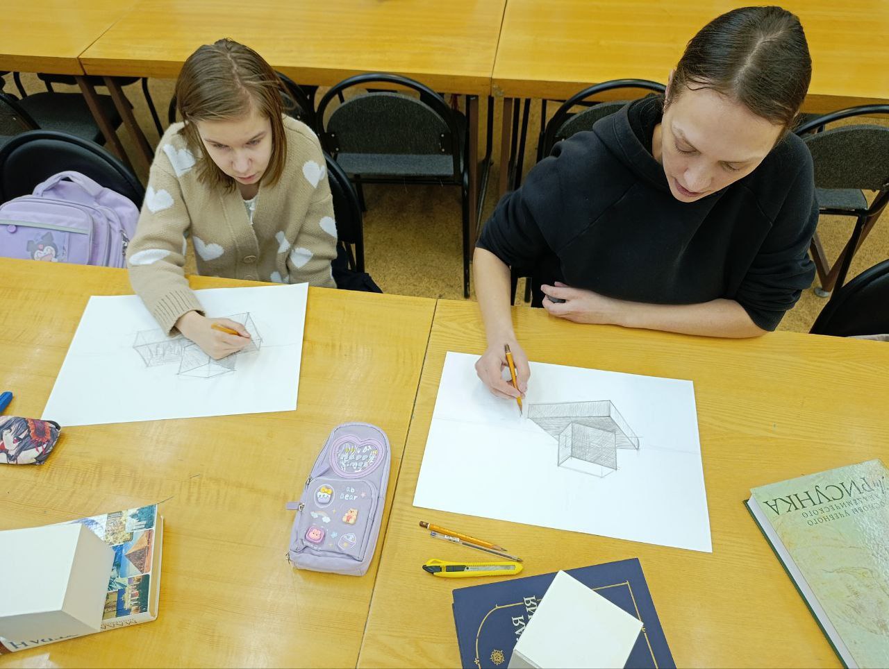 В библиотеке прошёл кружок по рисованию "Куб-построение". Наша юная художница 10 лет уверенно повторила основы рисунка! С помощью графитовых карандашей мы оживили натюрморт: строгий куб на уютной книге. Штриховкой мастерски передали игру света, глубокие тени и мягкие полутени – рисунок задышал объёмом! Это занятие укрепило навыки наблюдательности и контроля карандаша, развило чувство формы и света. Рисование натюрмортов учит видеть мир глубже, шаг за шагом раскрывая тайны объёма.