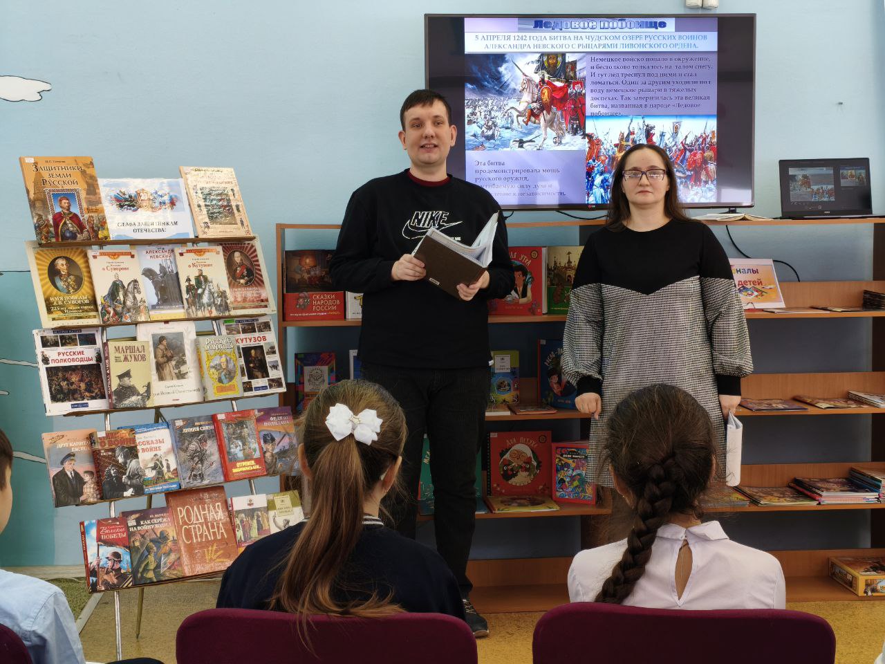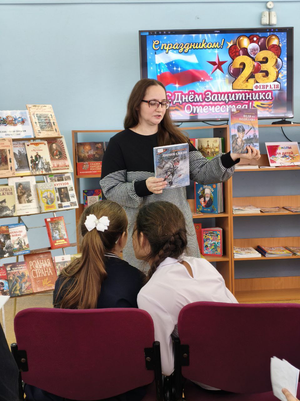 Сотрудник библиотеки рассказал о Дне защитника Отечества. Участники мероприятия вспомнили героев России разных эпох, которых объединяло одно – великая любовь к своей родине. Мероприятие было посвящено тем людям, чьи сила духа, честь, доблесть стали примером проявления наивысших нравственных человеческих качеств и ответственности перед Отечеством. Школьники познакомились с произведениями Ю. Яковлева, Л. Кассиля, С. Алексеева, прочитали стихотворения В. Степанова "23 февраля" и "Суворовец" из книги "Мы живём в России", подготовили выразительное чтение стихотворений, посвящённых празднику.