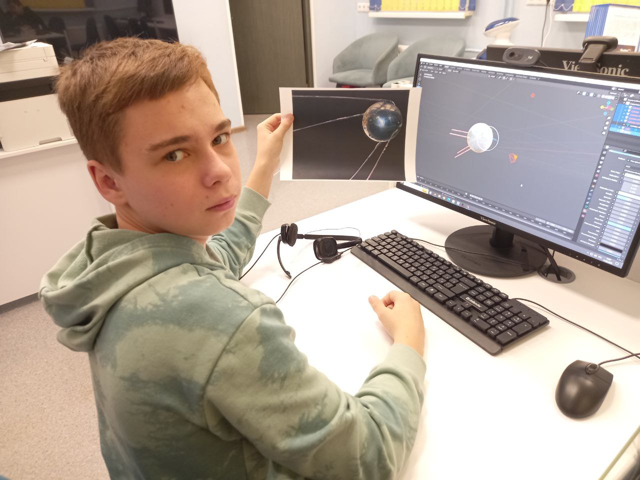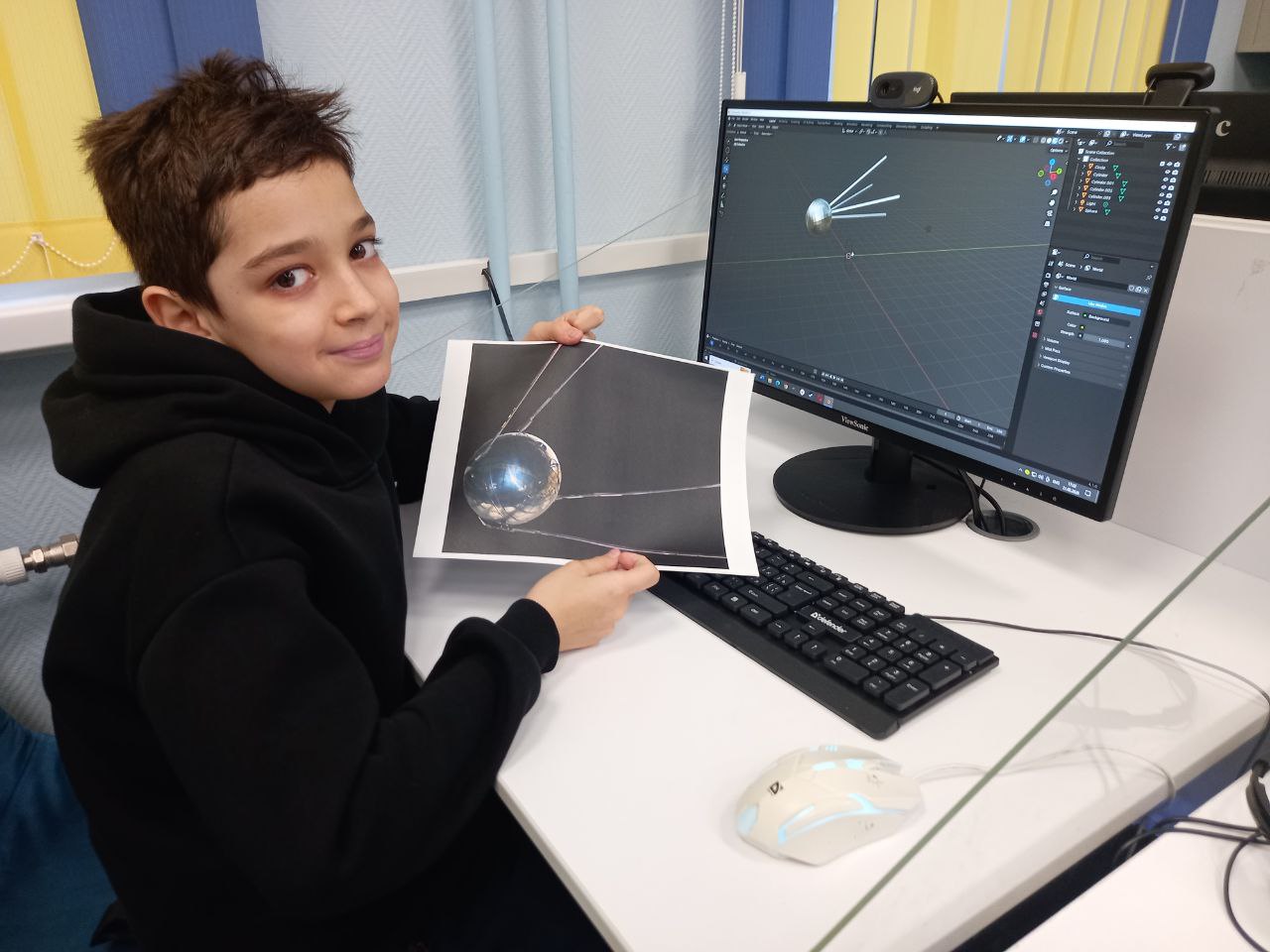 В библиотеке прошло занятие курса по изучению редактора трёхмерной графики Blender "Войти в IT". В продолжении курса "Космическое путешествие "Меж звёзд и галактик" сотрудник познакомил ребят с простейшими эффектами "металла" для создания модели Спутника.