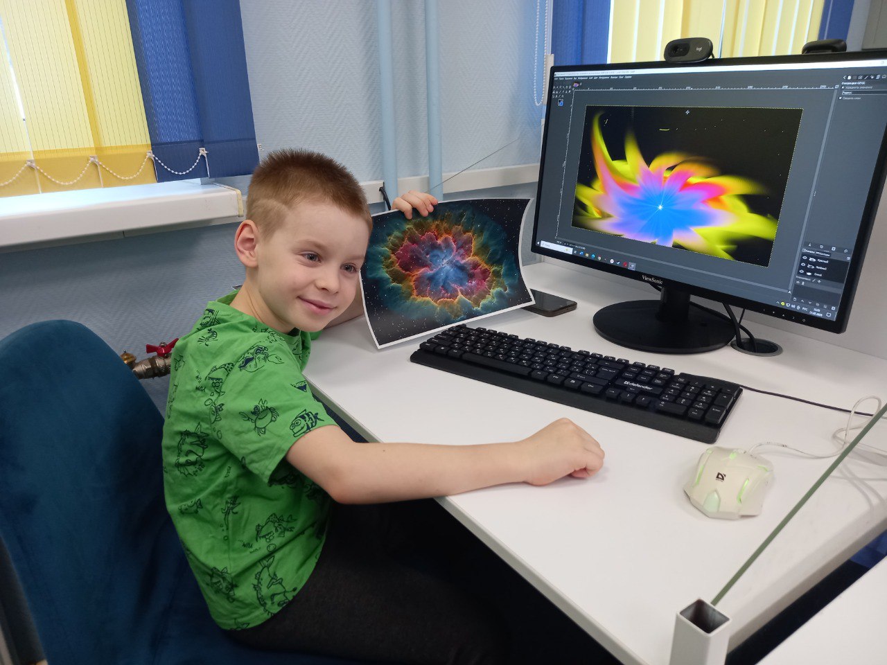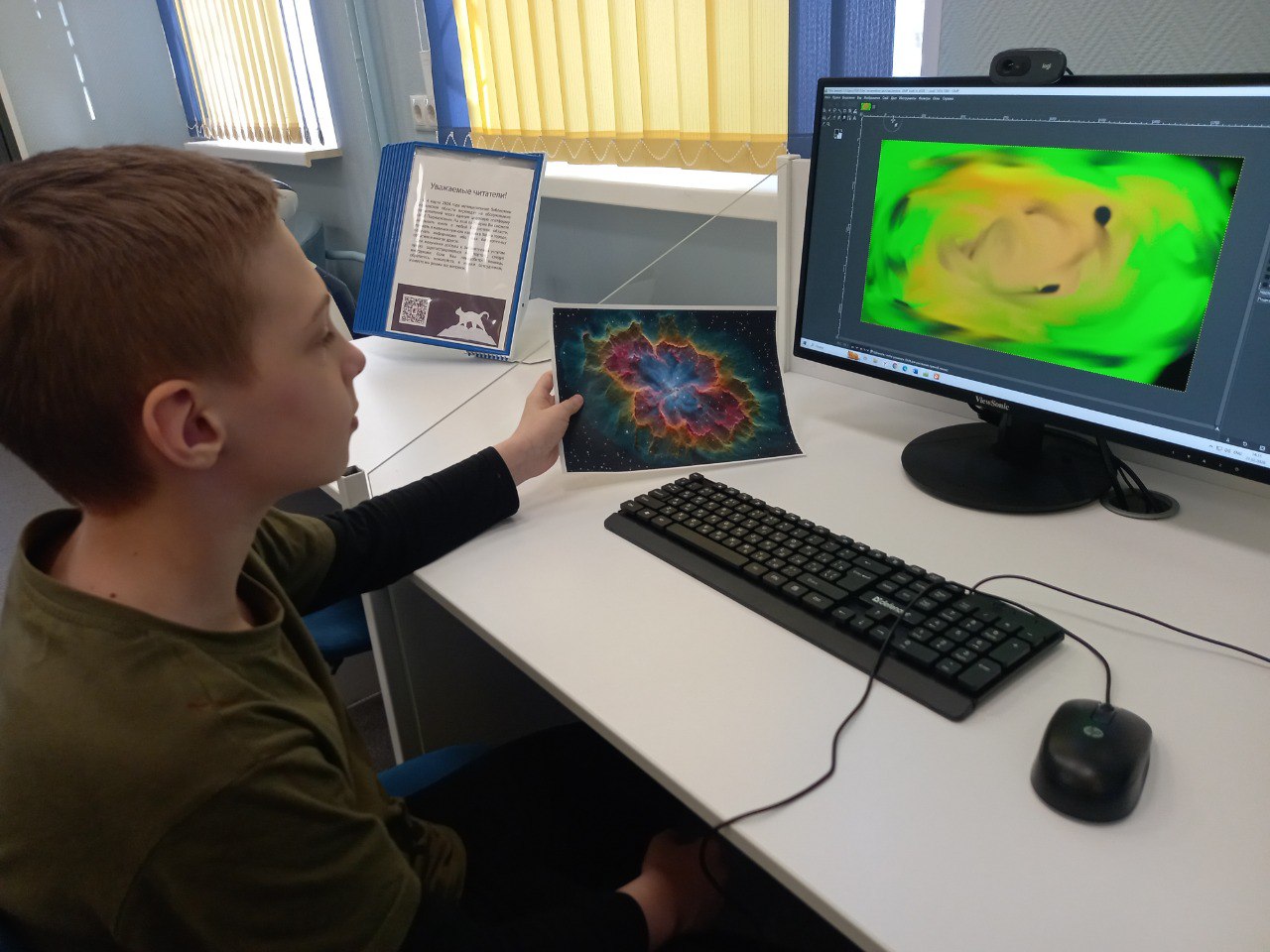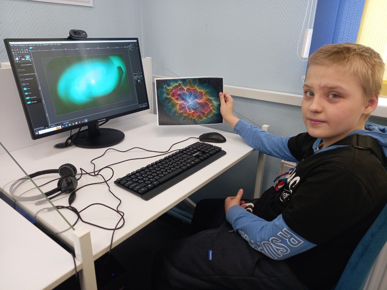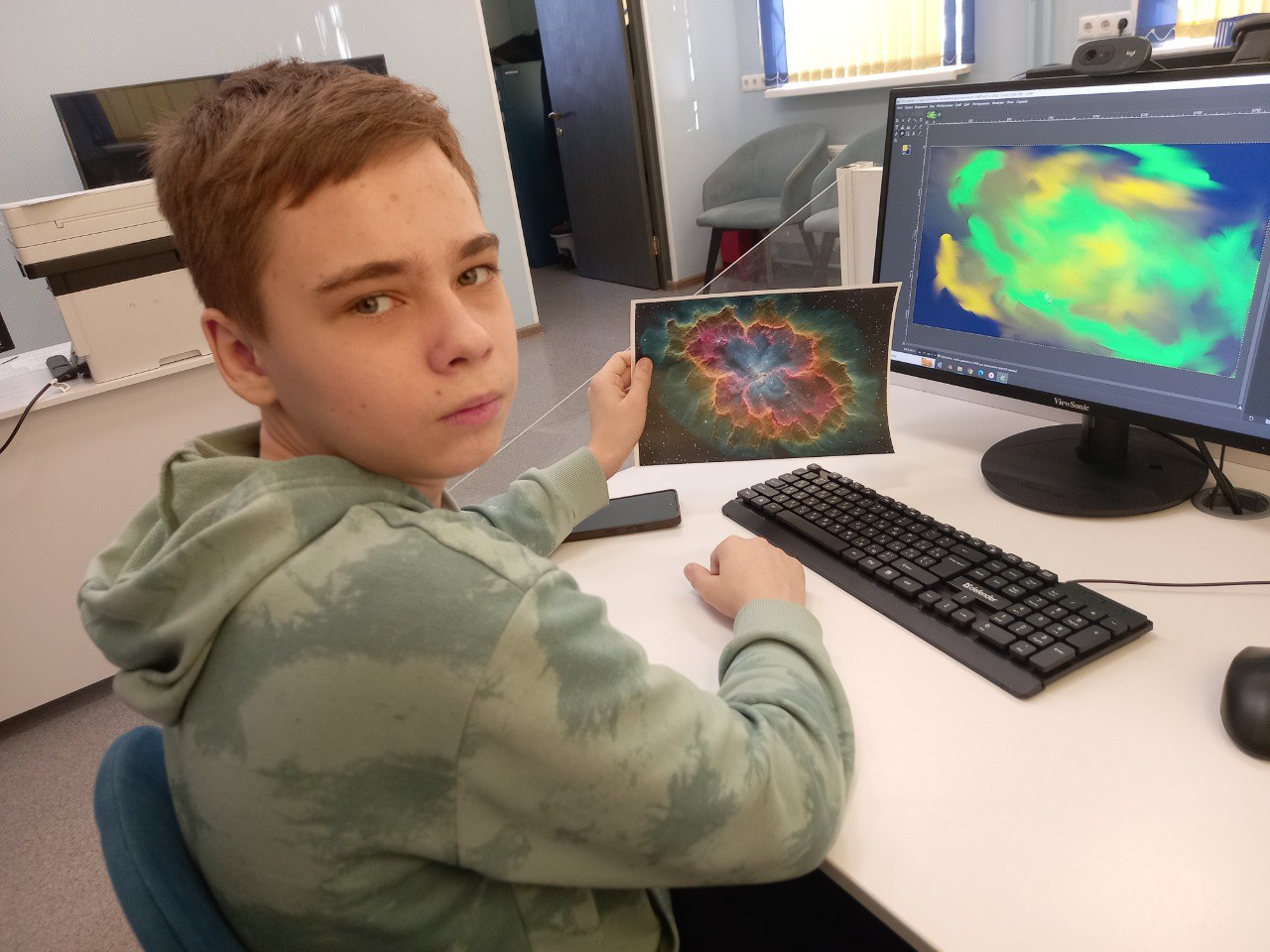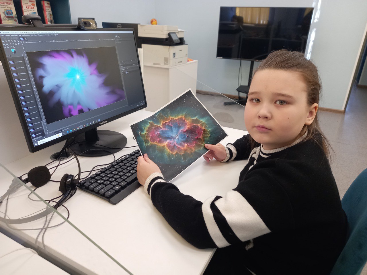 В библиотеке в рамках практического курса по графическому редактору GIMP "Gimpики" в продолжении курса "Космическое путешествие "Меж звёзд и галактик" ребята рисовали туманность, изучая инструмент "Размытие".