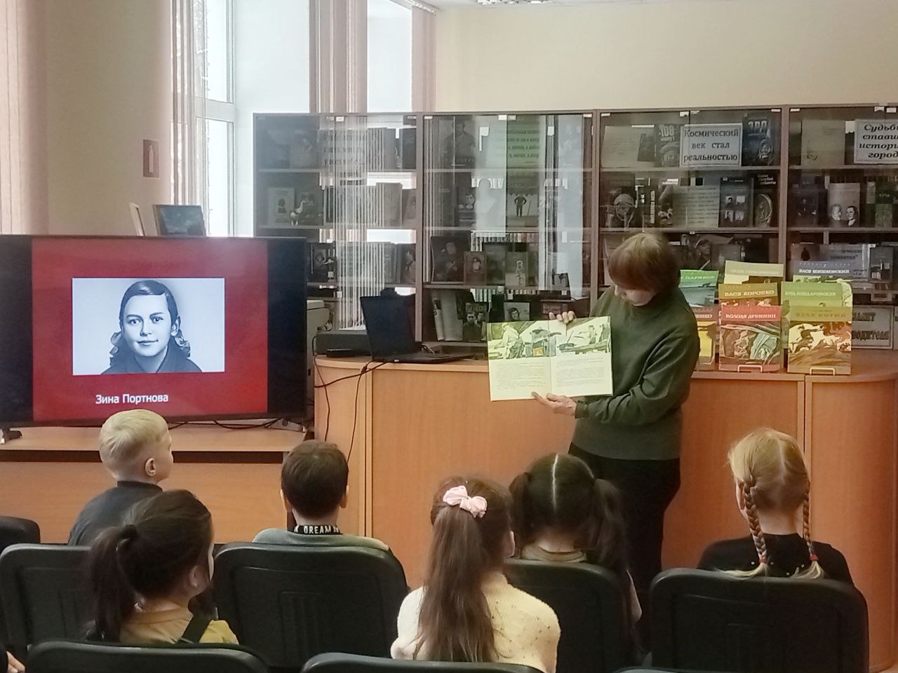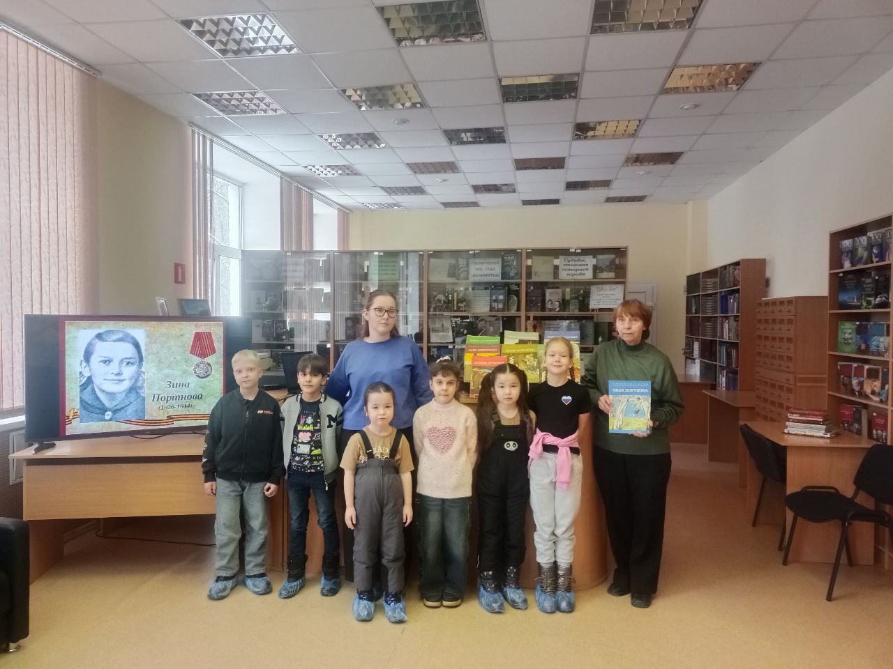 Час памяти "Юная героиня" прошёл в библиотеке для учащихся Гимназии № 9. Сотрудники библиотеки провели мероприятие для младшеклассников, посвящённое 100-летию со дня рождения партизанки Зины Портновой. Встреча состоялась в рамках акции "Защитники: от книги к делу".