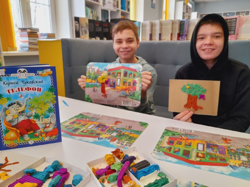 В библиотеке в рамках кружка "Колобок" состоялось творческое занятие, посвящённое сказкам Корнея Ивановича Чуковского. Это мир, где слова пляшут, предметы оживают, а детство никогда не кончается. Они полны игры, озорства и доброты. В них простые вещи учат читателя удивляться и смеяться, верить в добро и фантазию. Дети узнали много интересных эпизодов из его жизни, о том, как были написаны некоторые сказки. Затем под руководством сотрудника библиотеки ребята сделали своими руками расчудесное дерево из пластилина.