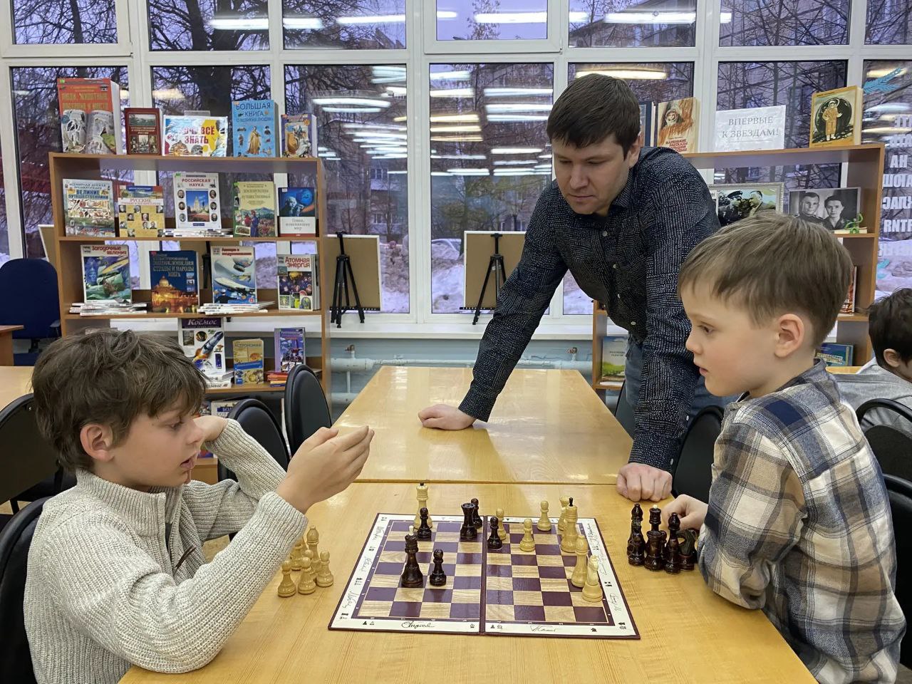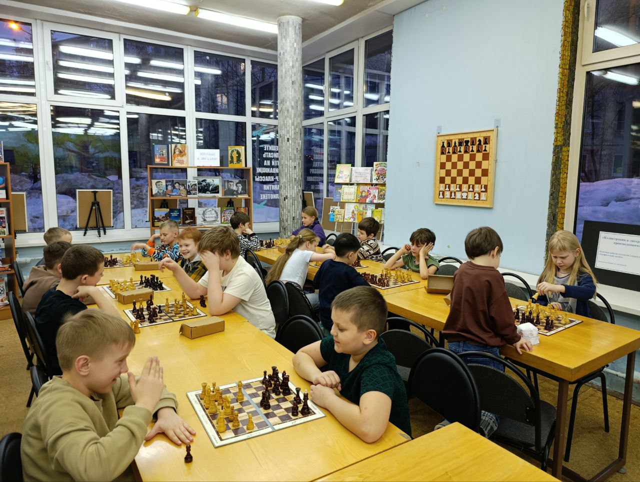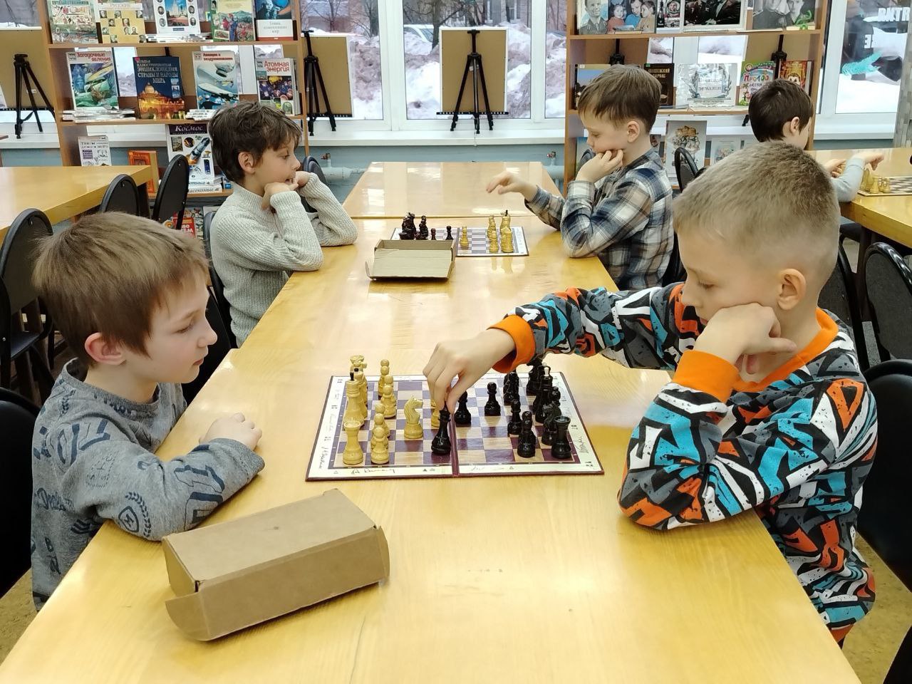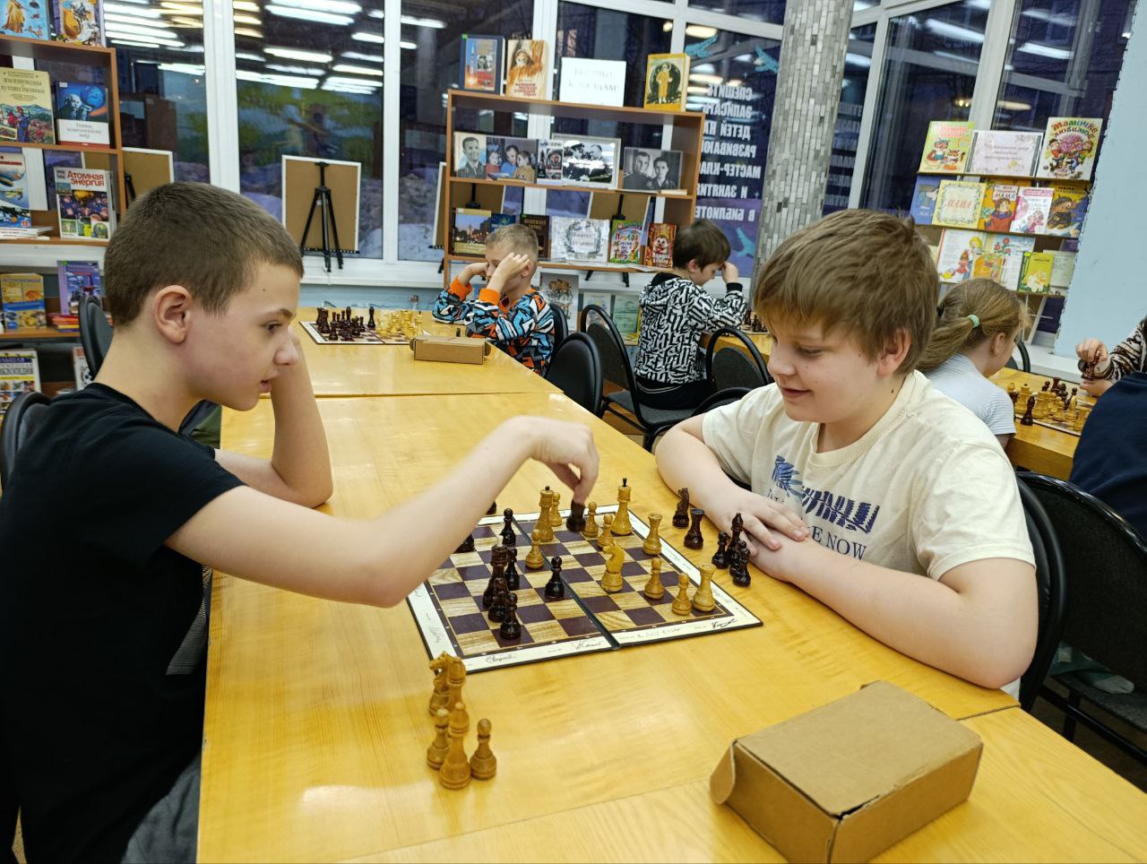 Прошло очередное занятие клуба любителей шахмат "Белая ладья". Дети разного возраста и уровня игры с большим удовольствием приходят в библиотеку, чтобы сразиться друг с другом в шахматы и с пользой провести свое свободное время.