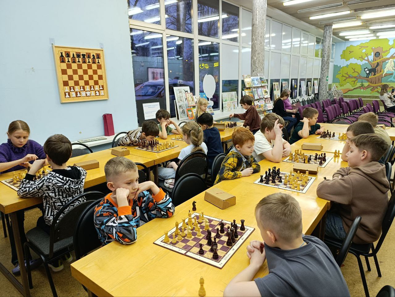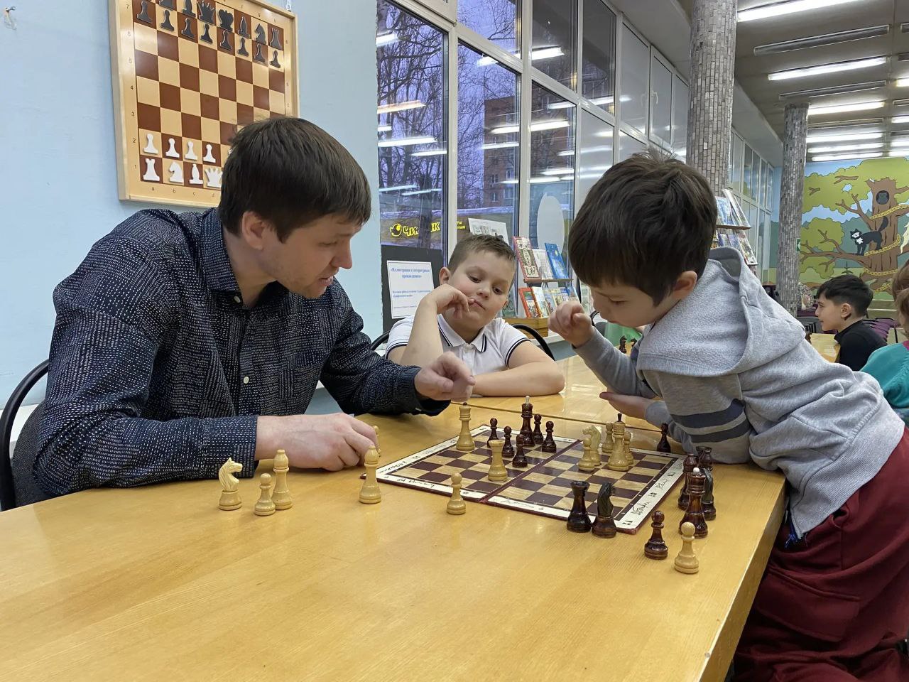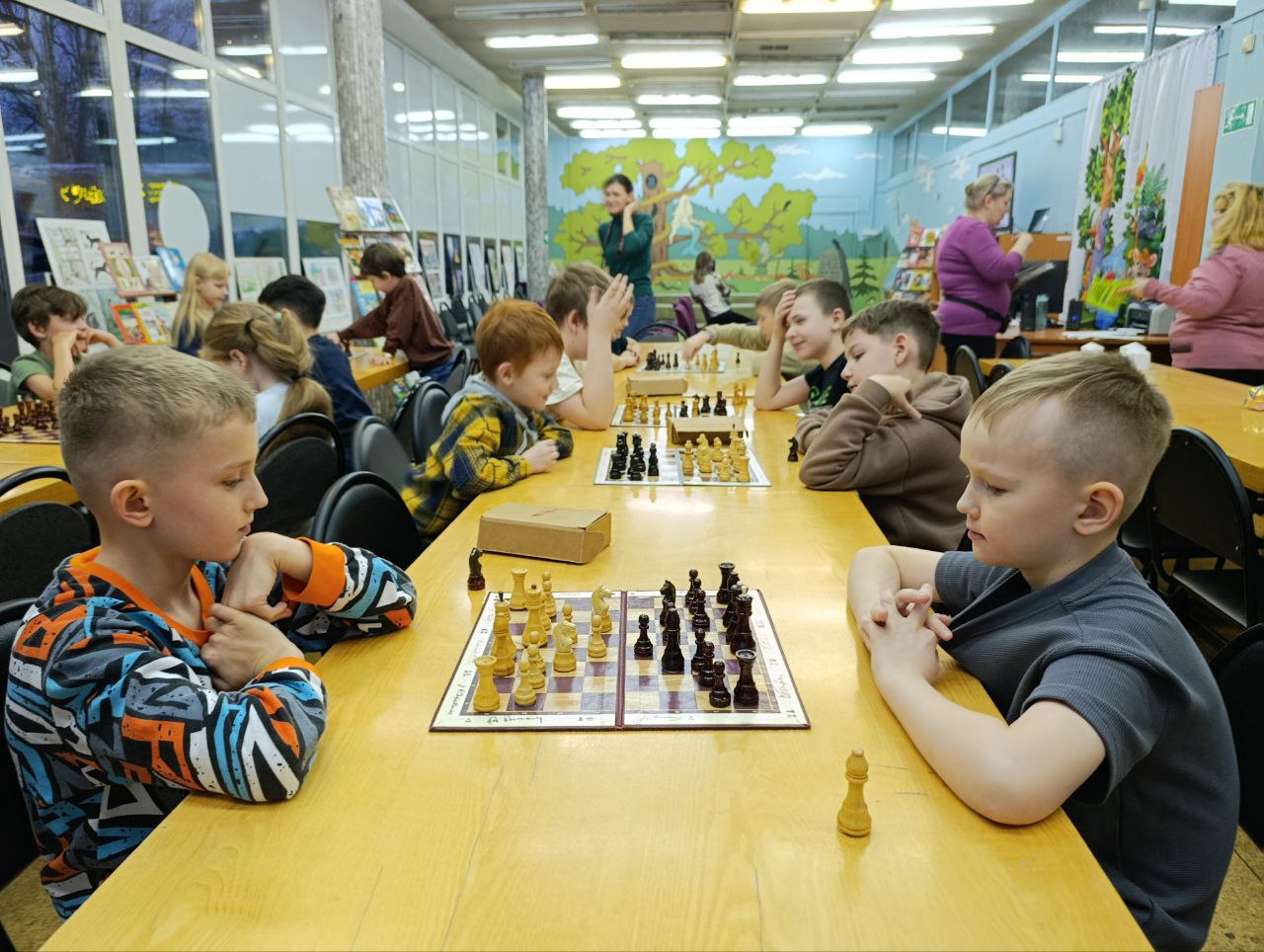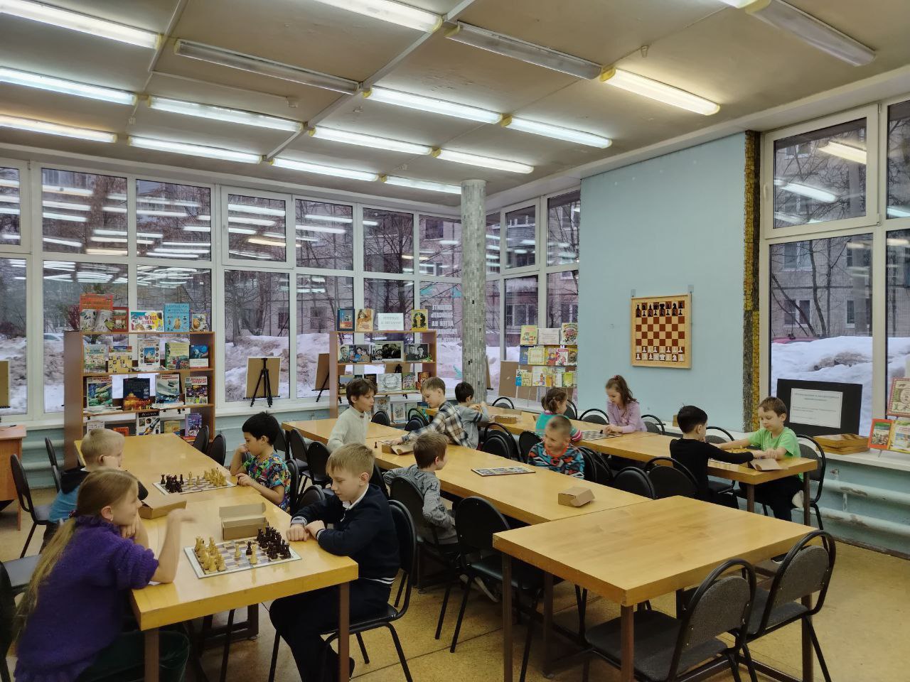 Прошло очередное занятие клуба любителей шахмат "Белая ладья". Дети разного возраста и уровня игры с большим удовольствием приходят в библиотеку, чтобы сразиться друг с другом в шахматы и с пользой провести свое свободное время.