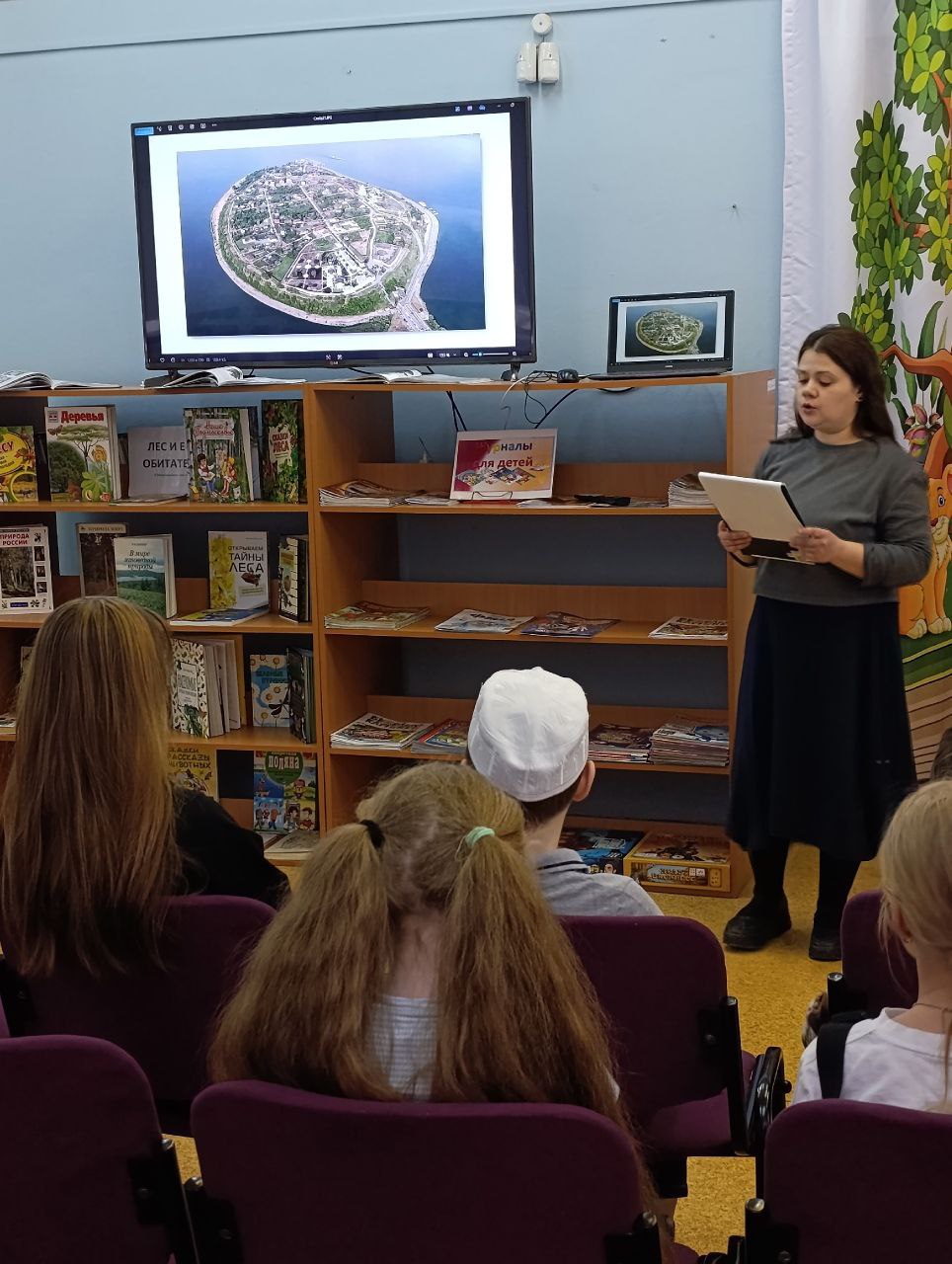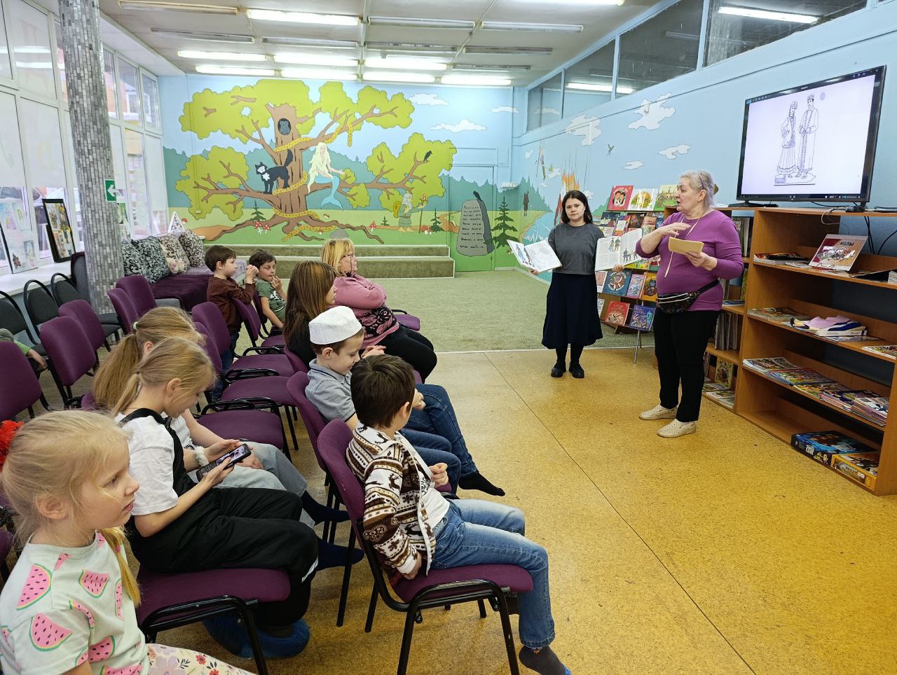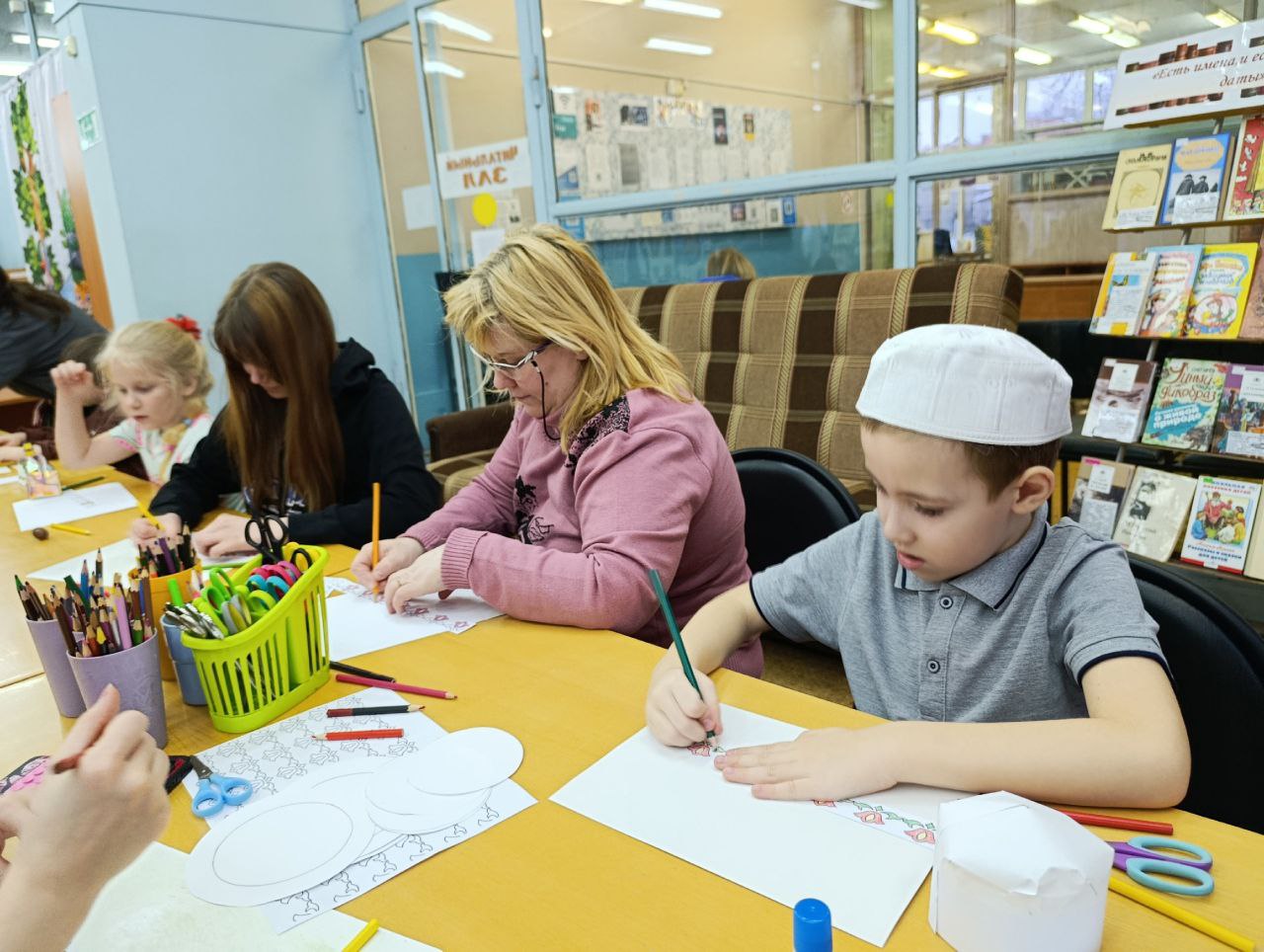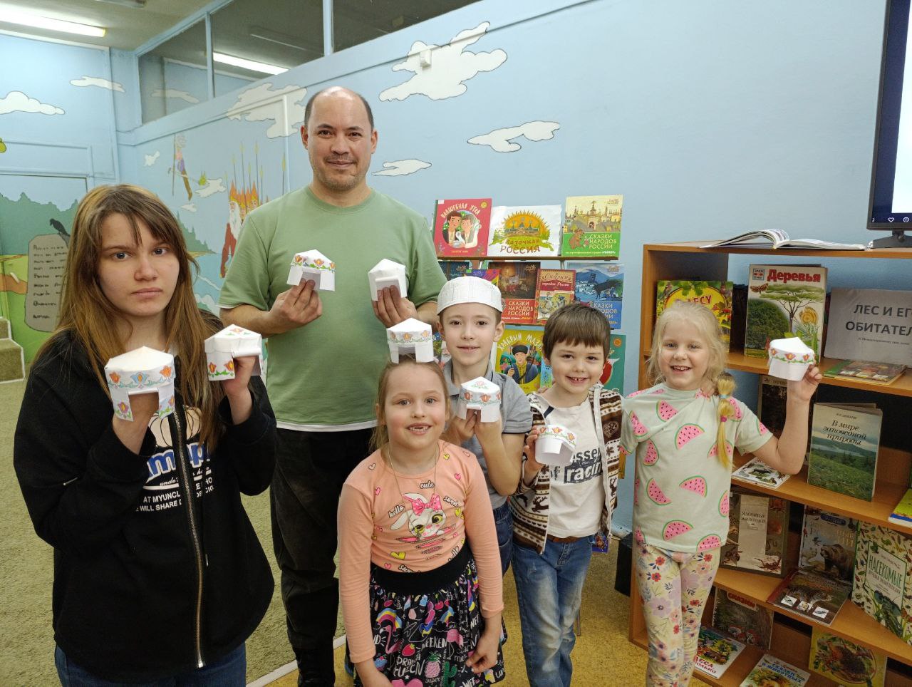 В библиотеке прошла встреча "Спутника", ставшая частью программно-проектной деятельности библиотеки "Я, ты, он, она, вместе – целая страна". Участники мероприятия отправились в путешествие по Республике Татарстан, любовались заповедниками, реками и озёрами, древними городами с красивейшей архитектурой. После путешествия по историческим городам и заповедникам мы отправились в Иннополис – город высоких технологий и инновационных разработок. Особое внимание было уделено татарскому народному костюму. Сотрудник библиотеки рассказал о материалах, головных уборах, обуви и традиционной татарской вышивке. Затем ребята вместе с родителями создали поделки при помощи бумаги, клея и цветных карандашей: собрали самую настоящую юрту и украсили её традиционным татарским орнаментом.