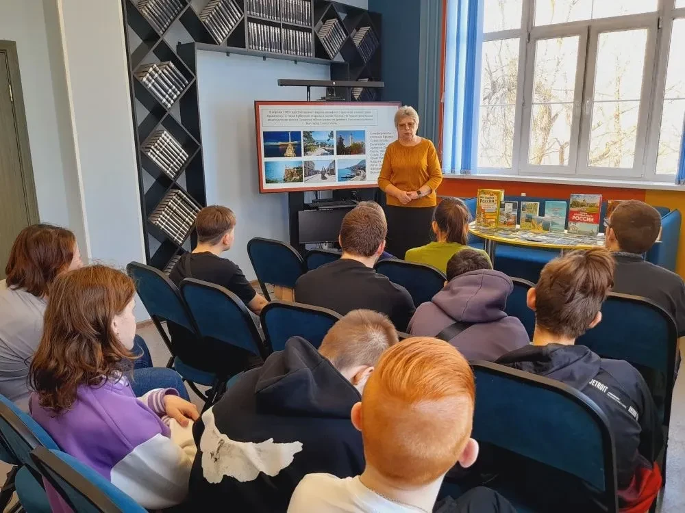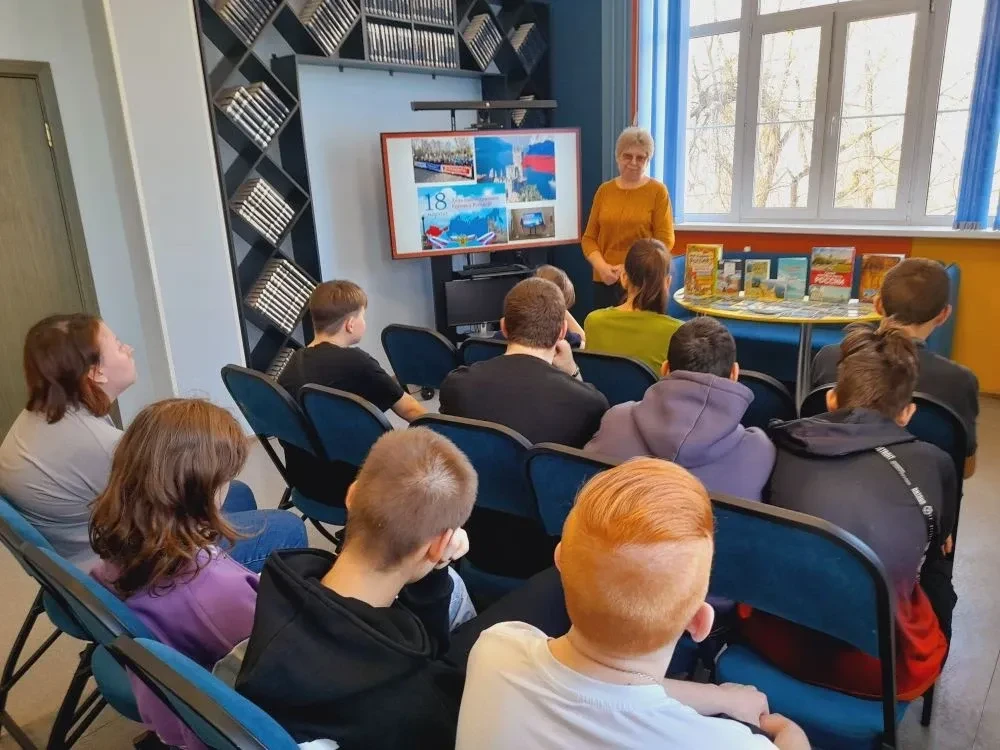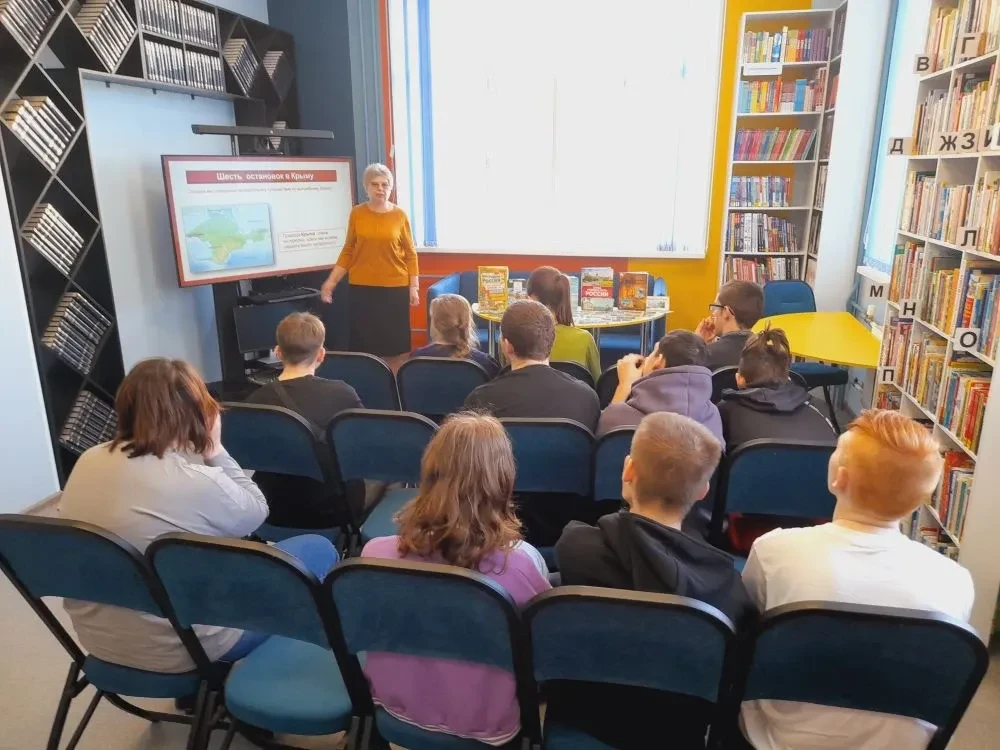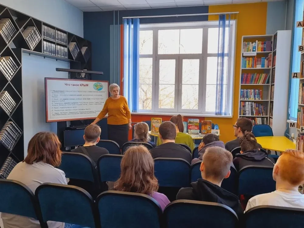 Библиотекарь рассказал участникам о том, что 18 марта 2014 года по итогам общенародного референдума был подписан Договор о принятии Республики Крым и города-героя Севастополя в состав Российской Федерации. Это решение стало знаковым в истории нашей страны и укрепило единство российской нации. После ребята совершили виртуальную экскурсию по достопримечательностям Крыма и смогли увидеть великолепные виды знаменитых памятников: Ласточкино гнездо, гора Ай-Петри.