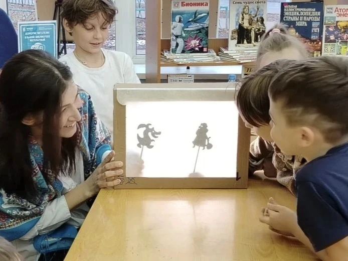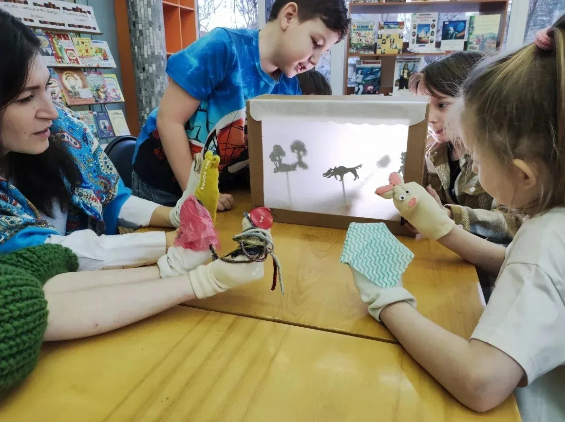 Мероприятие продолжилось знакомством с различными видами театров – пальчиковым, теневым и деревянным. Ребята создали куколок для театра на ладошке и даже смогли сыграть роли в небольшой сказке.