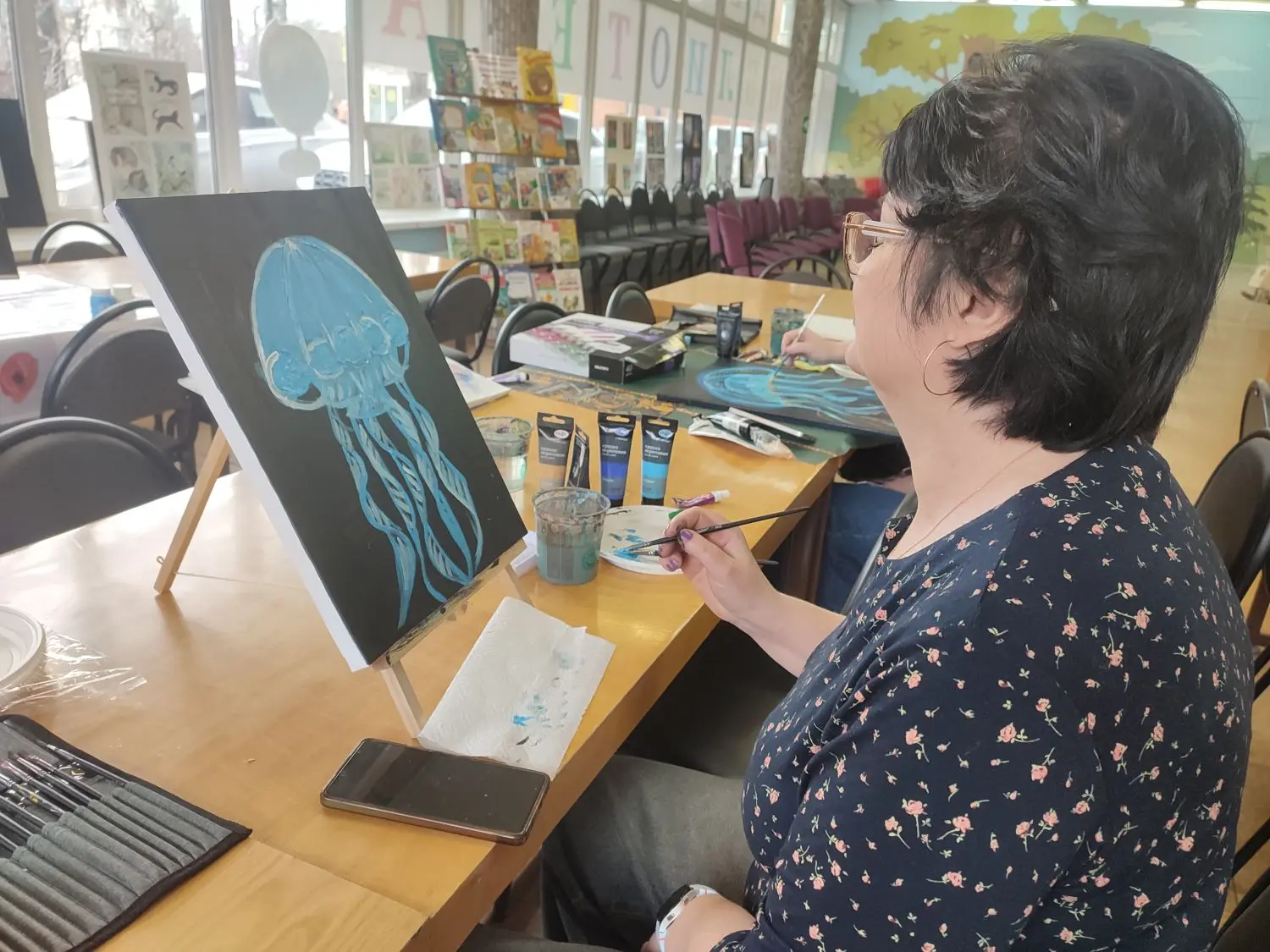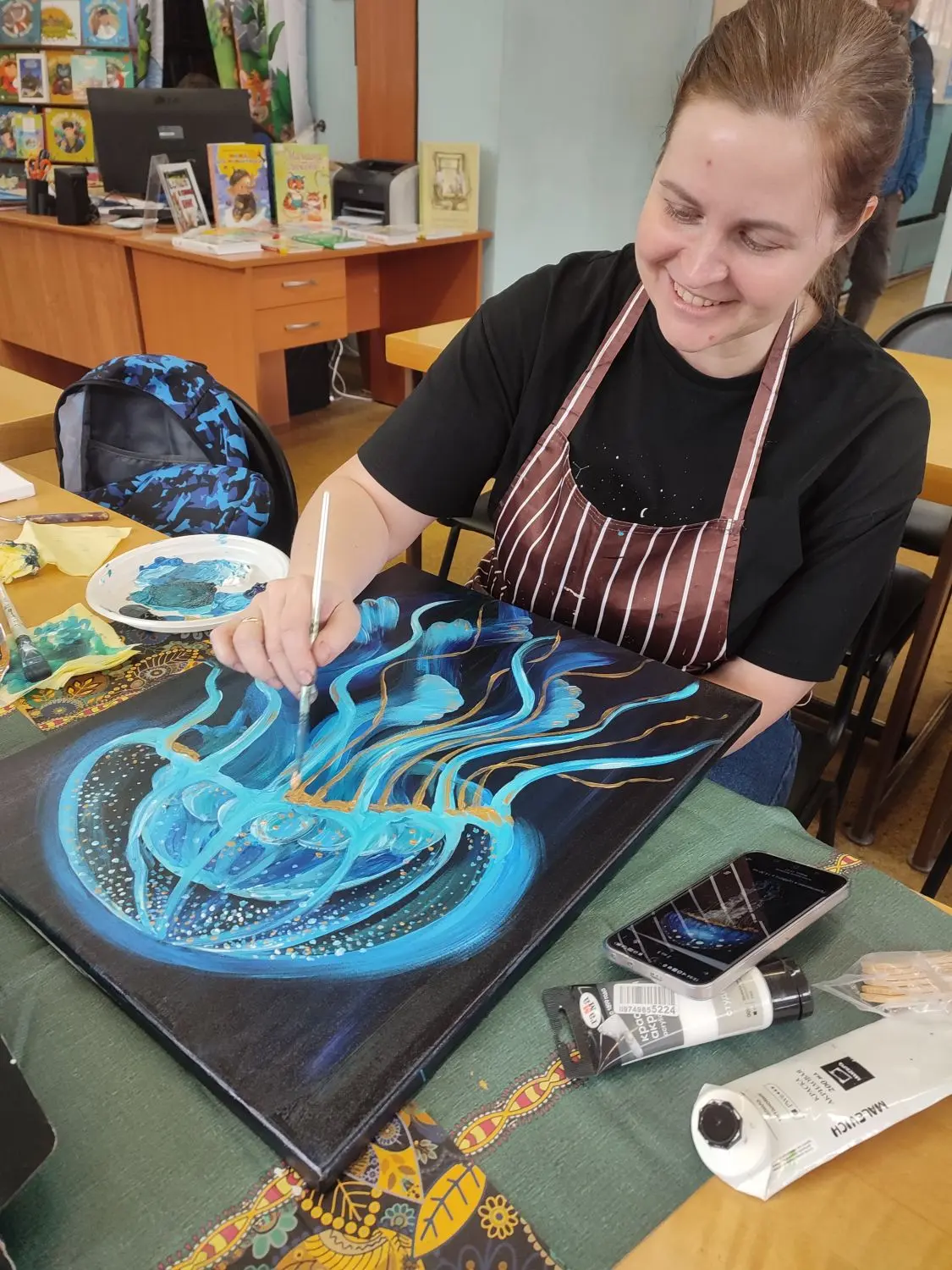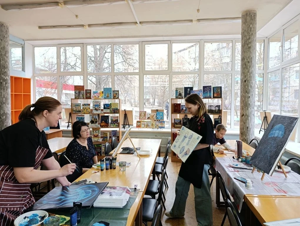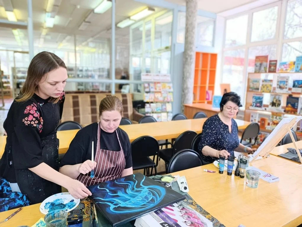 В библиотеке прошёл мастер-класс по рисованию акриловыми красками на холсте, на котором взрослые участники создали завораживающую медузу. Это яркое полотно с сияющим куполом в сине-золотых тонах и струящимися щупальцами стало настоящим воплощением морской магии. Морская медуза олицетворяет грациозный поток жизни: она не борется с течением, а следует ему, доверяя Вселенной и обретая силу в сдаче. В её прозрачности – символ чувствительности и ясности подсознания, где эмоции текут свободно, открывая путь к эмоциональному исцелению и внутреннему миру. Пусть эта хрупкая красавица напомнит: истинная сила – в гармонии с потоком, в простоте бытия и способности отпускать, чтобы исцеляться душой. Рисование для взрослых – это отдых для души и тела, возможность раствориться в творчестве, забыть суету и наполниться вдохновением. В каждом мазке акрилом вы учитесь течь с жизнью, освобождая напряжение и пробуждая скрытые эмоции для глубокого исцеления.