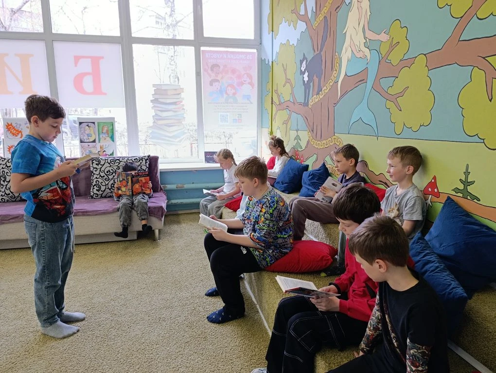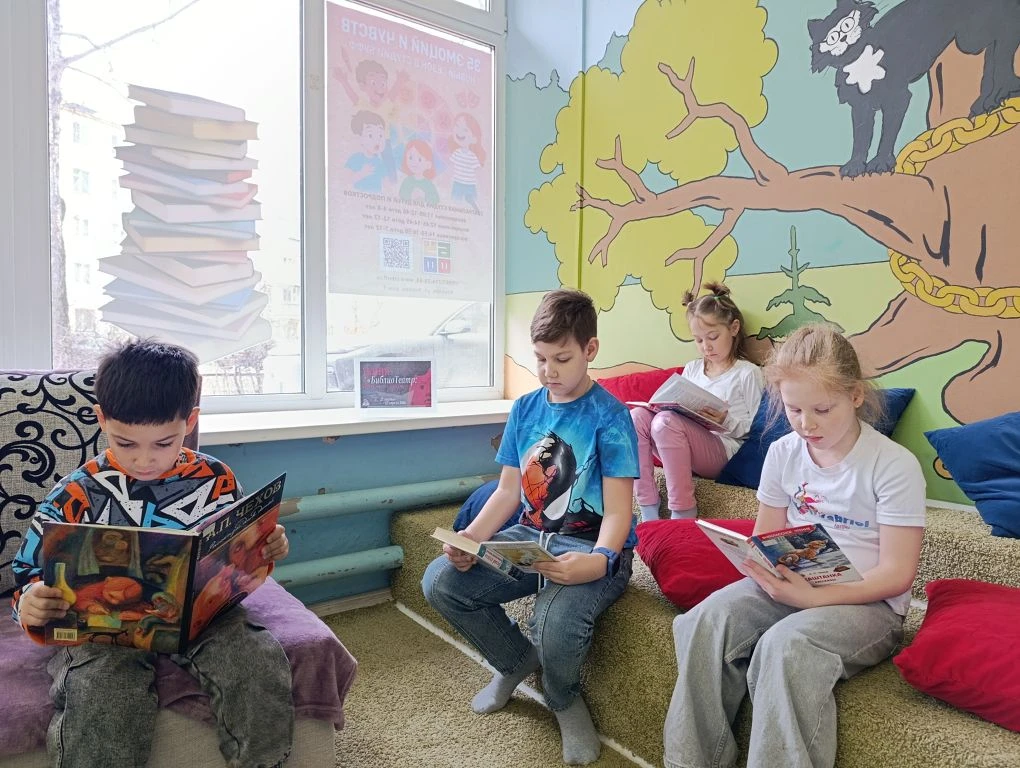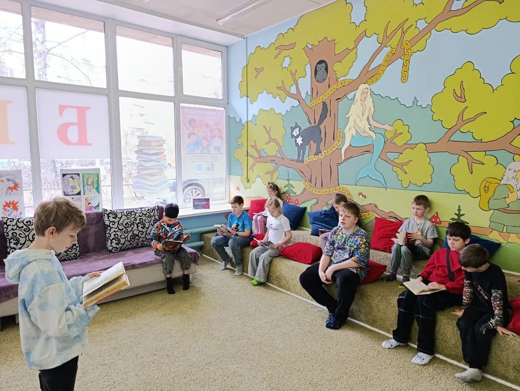 Сотрудники библиотеки и юные читатели создали уютную атмосферу на зонированном пространстве с подушками, где вслух читали классические произведения с элементами театрализации.
